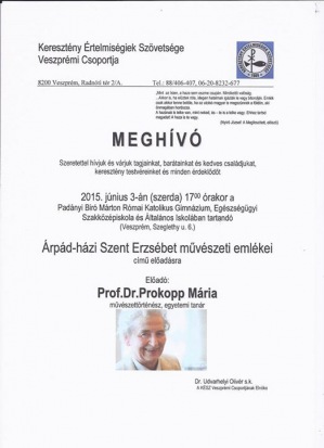A Keresztény Értelmiségiek Szövetsége (KÉSZ) veszprémi csoportja meghívására Prof. Dr. Prokopp Mária művészettörténész, egyetemi tanár tart előadást Árpád-házi Szent Erzsébet művészeti emlékei címmel június 3-án, szerdán 17 órakor a Padányi Biró Márton Római Katolikus Gimnázium, Egészségügyi Szakközépiskola és Általános Iskolában (Veszprém, Szeglethy u. 6.).