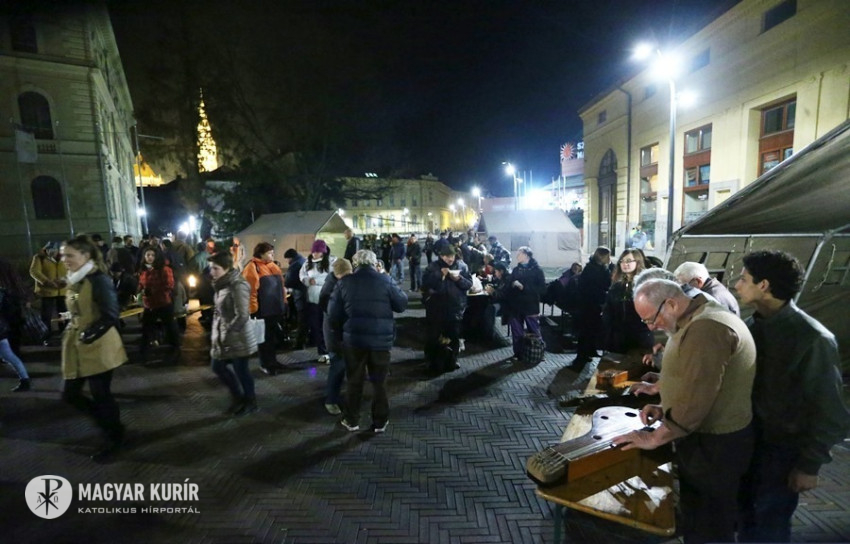 A téren meleg étellel, zenével, adományokkal és néhány jó szóval várták a fedél nélkülieket. „Bár tudnám, hova, de hova, de hova, de hova megyek” – játszotta az Illés együttes klasszikusát a Dugonics téren verbuválódott zenekar szerda este. Az őket hallgató hajléktalanok tenyerükkel, talpukkal követték a ritmust, jó hangulatukban talán egy pillanatra meg is feledkezve arról, hogy ezt a kérdést minden reggel felteszik maguknak. A Szegedi Katolikus Egyetemi Lelkészség által immár tizedik alkalommal meghirdetett Szolidaritás Éjszakája nem oldja meg a hajléktalanok gondjait, de nem is az a célja. Egy lehetőség csupán, hogy a téren átsétáló emberek belenézhessenek azokba az arcokba, melyek láttán a legtöbbször inkább elfordítják a fejüket.