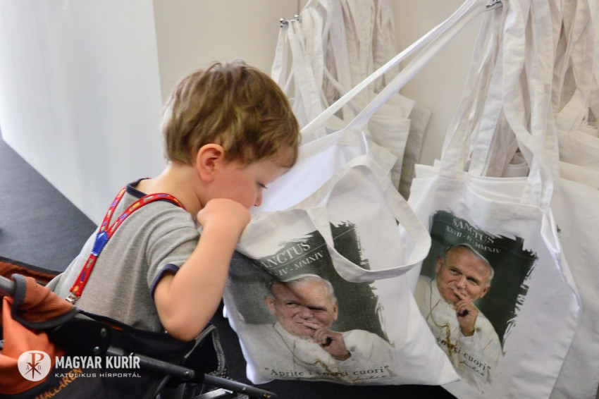 Kisfiú kukucskál bele egy II. János Pál arcképével díszített vászontáskába az "Alázat és bátorság, amely megváltoztatta a történelmet" című kiállítás ajándékboltjában. A Vatikáni Múzeumban rendezett kiállítás fotókkal és videókkal mutatja be a holnap szentté avatandó két pápát.