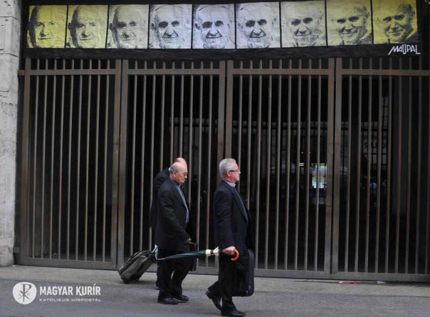 Hármas portré a római Borgo Pio utcában a "kegytárgyak" felirat alatt.