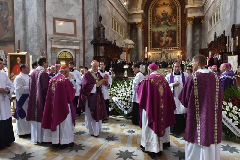A gyászszertartást megelőzően a dicsőséges rózsafüzért imádkozták el az augusztus 17-én, hétfőn elhunyt főpásztor lelki üdvéért. A végakaratának megfelelően elmondott liturgia Paskai bíborosnak – az esztergomi bazilika főoltára előtt felállított – koporsója előtt zajlott a jelenlévő püspökök vezetésével.
