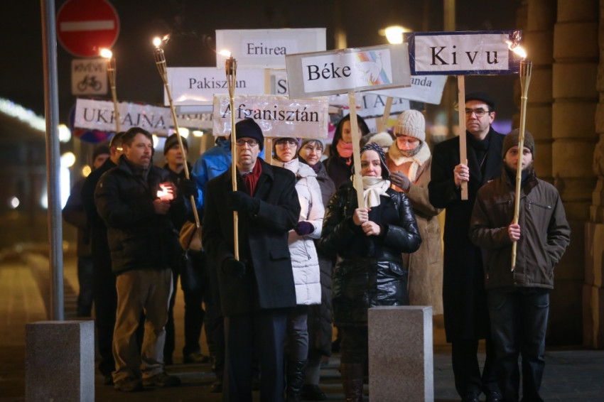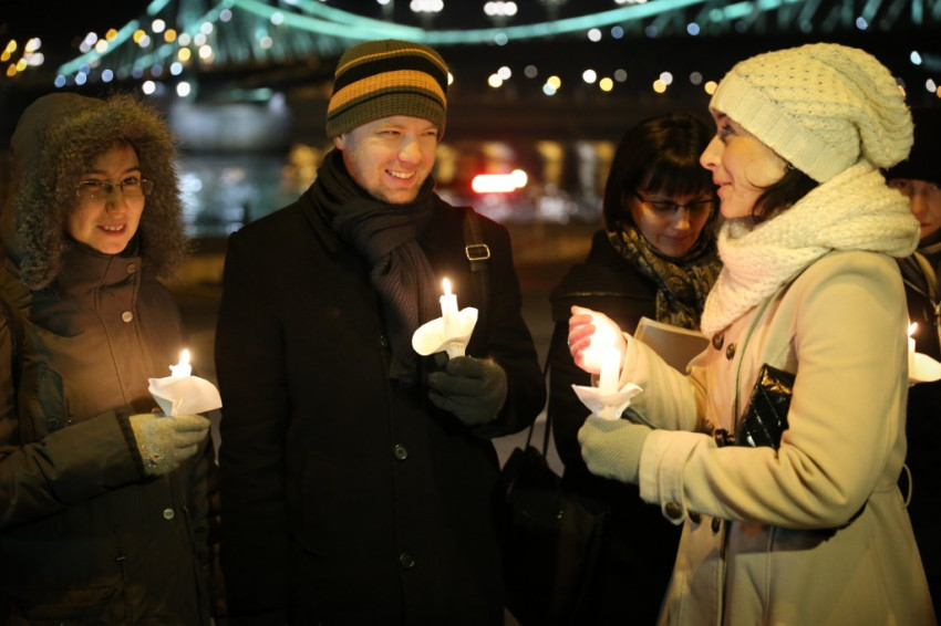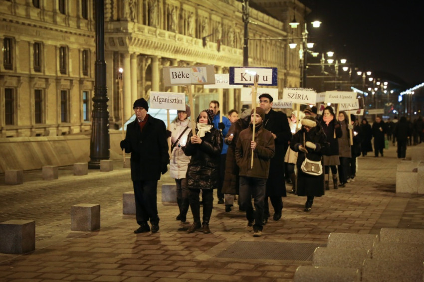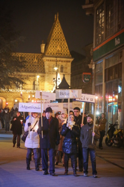 A résztvevők a Salkaházi Sára rakparton, a vértanú szerzetesnővér emlékét őrző márványtáblánál gyújtották meg mécseseiket. Szőke Péter, a Szent Egyed közösség magyarországi vezetője felolvasott a Békét az egész földnek című békekiáltványból, amellyel közösségük csatlakozik Ferenc pápa szándékához: „Nyilvánítsuk ki újra szolidaritásunkat a háború, a terrorizmus, a mindenféle erőszak és a rabszolgaság minden áldozata iránt. Meg vagyunk róla győződve, hogy a béke mindig lehetséges és minden folyamatban lévő konfliktust meg lehet oldani békés eszközökkel.”