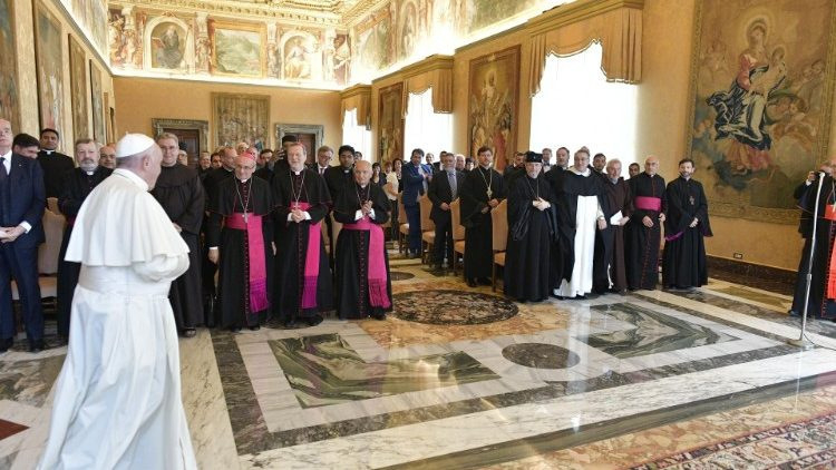 A mintegy száz résztvevőnek mondott beszédében Ferenc pápa felidézte a közelmúltban Bulgáriában, Észak-Macedóniában és Romániában tett látogatását, melyek során kapcsolatba került a keleti egyházakkal. Megemlítette a 2018. július 7-i ökumenikus imatalálkozót is, amikor Bariban együtt fohászkodott a békéért a közel-keleti pátriárkákkal.