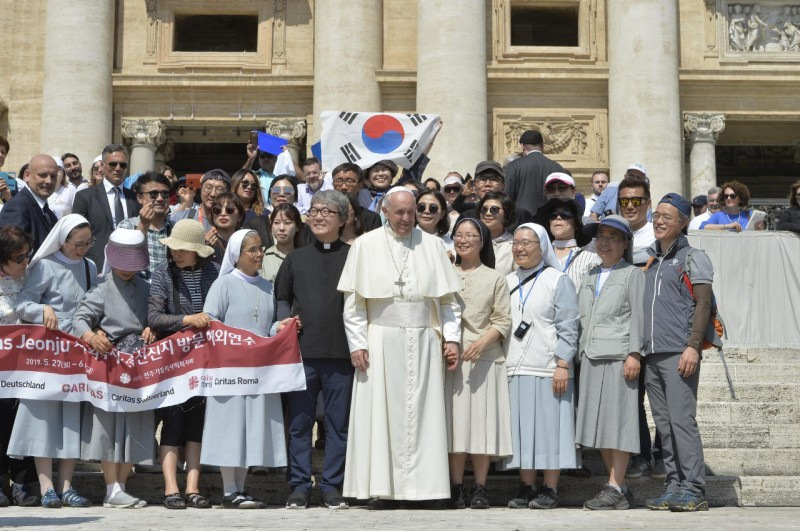 Szombaton, június 8-án lesz ötödik évfordulója annak, amikor itt, a Vatikánban az izraeli és a palesztin elnök találkozott velem és Bartholoméosz pátriárkával. 13 órakor tartsunk „egy perc csöndet a békéért”, amikor a hívők imában, a nem hívők pedig gondolatban mindnyájan közösen nyilvánítják ki egy testvériesebb világ iránti vágyukat. Köszönöm a nemzetközi Actio Catholicának, hogy ezt a kezdeményezést elindította!