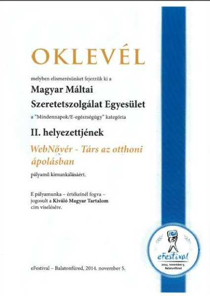 Az elmúlt időszakban megjelent weblapok közül a legjobbakat az Infotér konferencia keretében díjazták. A Magyar Máltai Szeretetszolgálat Webnővér – Társ az otthoni ápolásban honlapja az eFestival éves értékelésén a „mindennapok/egészségügy” kategóriában második díjat kapott. A weboldal az elismeréssel jogosulttá vált a „Kiváló magyar tartalom” címre.