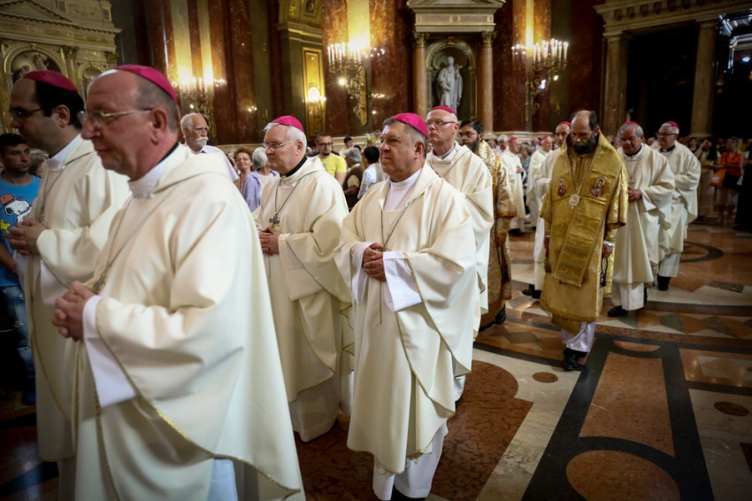A mai szentmise végén megújítjuk hazánk felajánlását Jézus Szentséges Szívének. Ezt az imádságot alig eltérő formában már Vaszary Kolos prímás elmondta a millennium évében, 1915-ben pedig Csernoch János vezetésével püspöki karunk ajánlotta fel a háborútól és reménytelenségtől gyötört Magyarországot az isteni szívnek. Amikor most, száz év múltán megújítjuk ezt a felajánlást, mai fájdalmainkra, lelkiismeret-furdalásainkra és reményeinkre gondolunk. A több mint hatmillió abortuszra, az elöregedő társadalomra, arra, hogy népünk szinte hánykolódik azon a tengeren, amit a globális gazdaság és politika, az emberiség elemi erejű mozgásai viharként korbácsolnak. Hinnünk kell abban, hogy a mindenható Isten szemében értékesek vagyunk, hogy szeret minket. Csak így van értelme jószándékú igyekezetünknek, amely emberi mértékkel gyengének látszik, de ha Isten tervéhez igazodik, részese lehet a Mennyei Atya már köztünk lévő és az idők végén kiteljesedő országának, amelynek eljövetelét a Miatyánkban nap, mint nap kérjük.