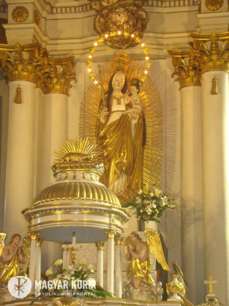 A szentmise elején Urbán Erik OFM templomigazgató kifejtette: „a csíksomlyói kegytemplom, a pápai kisbazilika legdrágább kincse az Oltáriszentség után a Szűzanya kegyszobra. A körülbelül ötszáz éves, reneszánsz stílusú kegyszobor hársfából készült. Alkotója ismeretlen. Magassága 2,27 m. A világon ismert kegyszobrok közül a legnagyobb. A napba öltözött Asszonyt ábrázolja, akinek lába alatt van a hold, fején a tizenkét csillagból álló koszorú. Királynőként is ábrázolja Szűz Máriát: fején korona, jobb kezében jogar, bal karján tarja Szent Fiát, a világ Megváltóját. 1798-ban Batthánnyi Ignác erdélyi püspök idején az egyház Csodatevő, segítő szent Szűznek nevezi el.”