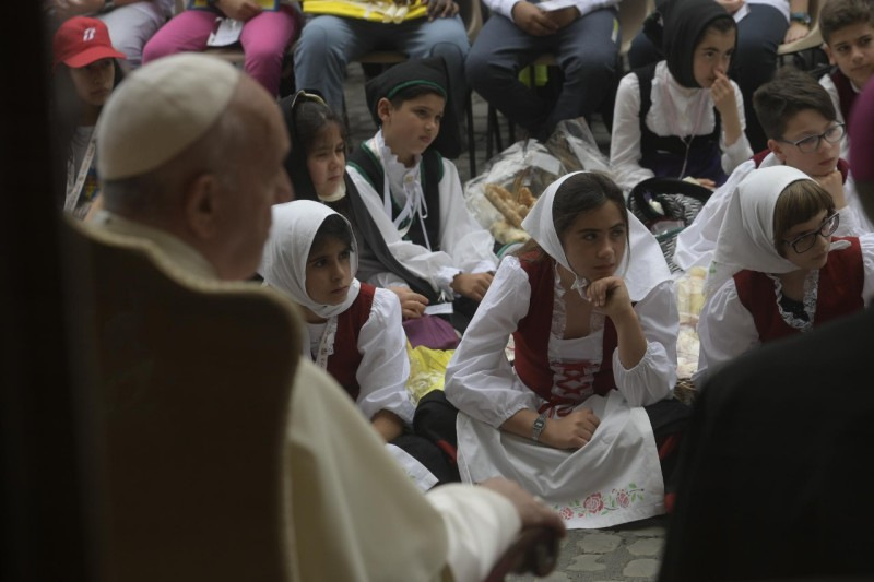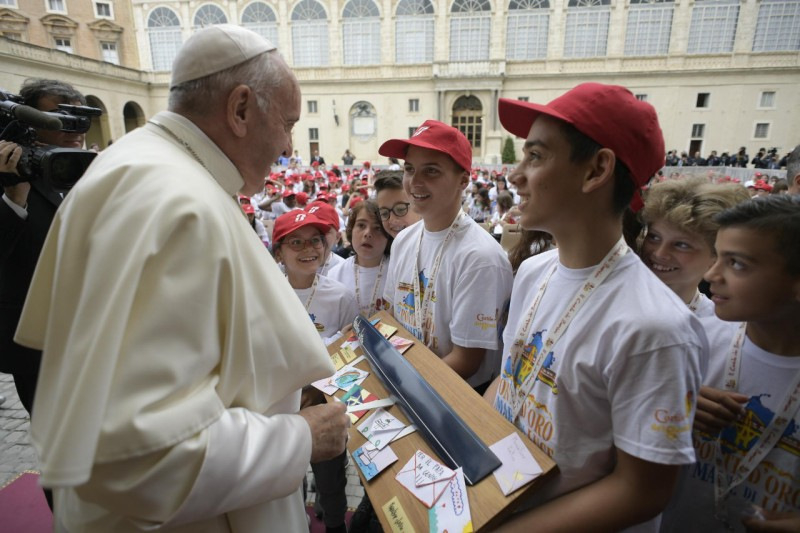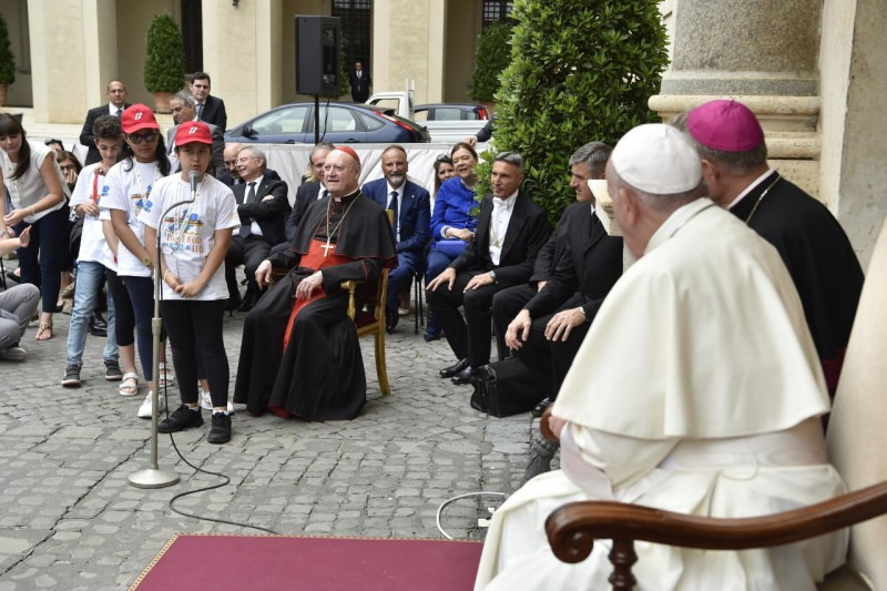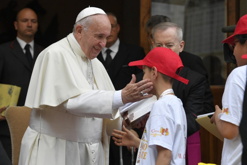 A gyerekek az Apostoli Palota Szent Damazusz udvarán találkoztak a pápával, akinek kérdéseket tehettek fel. Először egy genovai kislány kérdezett: Ferenc pápa annak idején milyen diák volt?