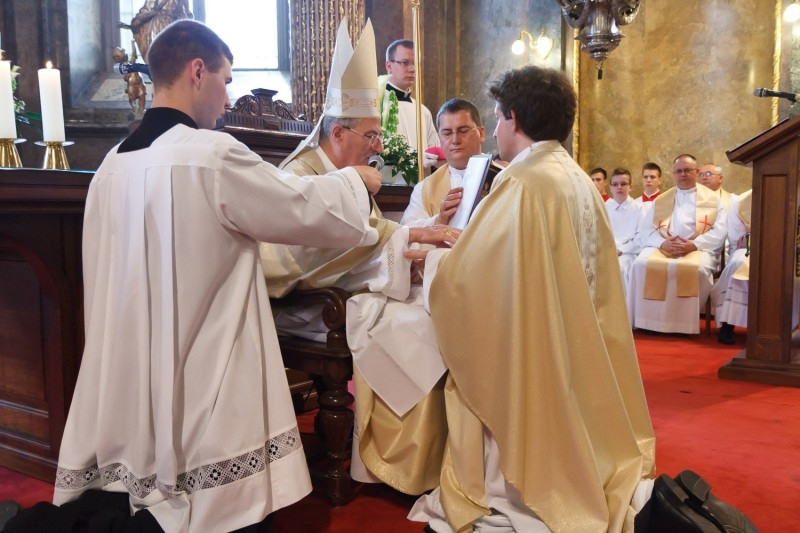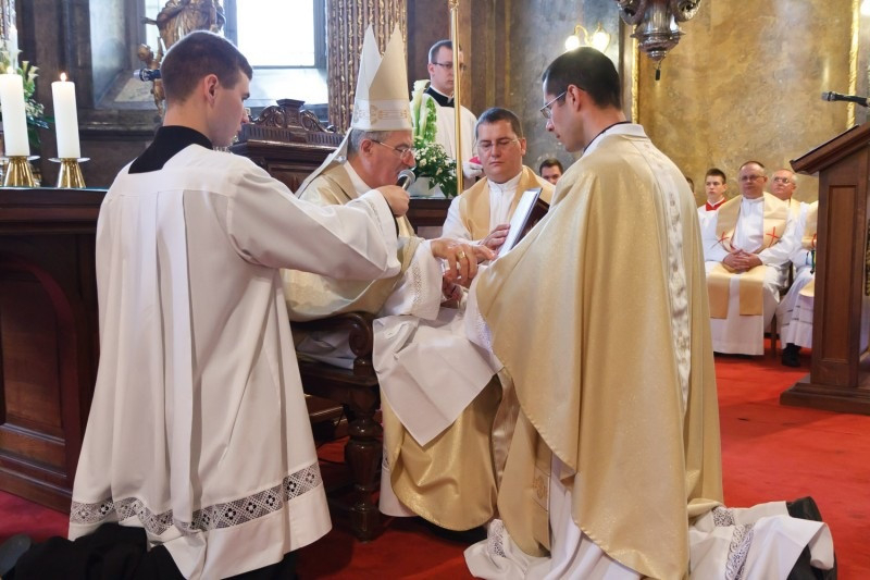 A homília után került sor a szentelési szertartásra, melynek lényeges mozzanata, amikor a főpásztor kézrátétellel a szentelés és az áldás gesztusa mellett a papi rend folytonosságát is kifejezi az új áldozópapok felé.
