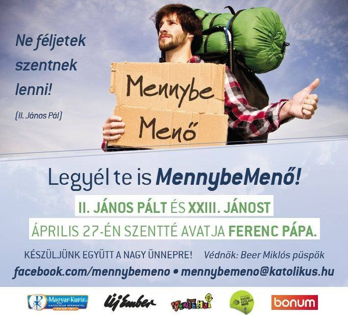 Örömmel buzdítok mindenkit a MennybeMenő kezdeményezésben való részvételre, amely XXIII. János és II. János Pál pápák szentté avatásához kapcsolódóan, az egyházfők életpéldája, tanítása mentén a mai kor nyelvén, frissen, fiatalos lendülettel mutat rá a mennyország örömére, egyben Krisztus derűs, elkötelezett követésére hív.
