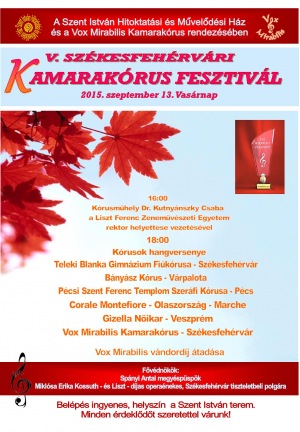 A Spányi Antal megyés püspök úr és Miklósa Erika, Kossuth- és Liszt-díjas operaénekes, Székesfehérvár tiszteletbeli polgára fővédnökségével megrendezésre kerülő V. Székesfehérvári Kamarakórus Fesztivál hangversenye szeptember 13-án, vasárnap 18 órakor kezdődik a Szent István Művelődési Ház Szent István termében. Minden érdeklődőt szeretettel várnak.