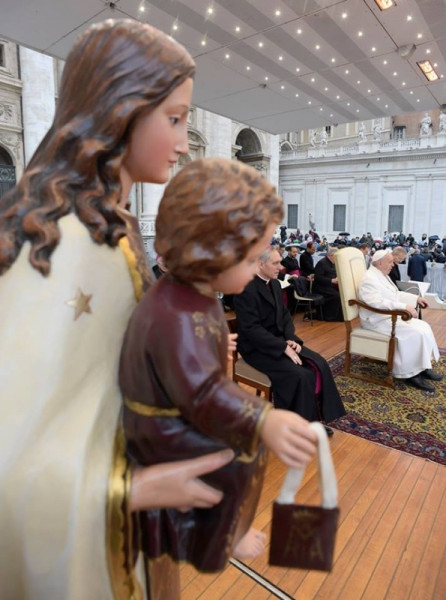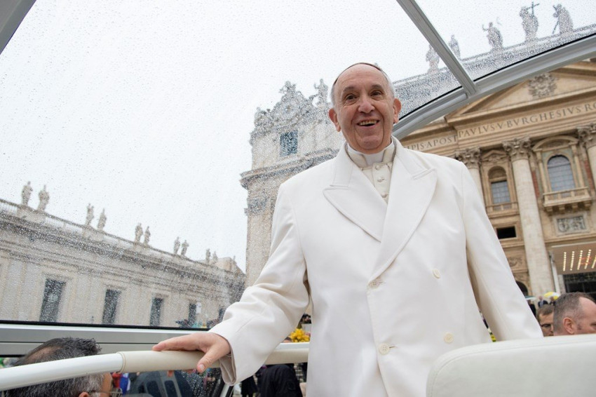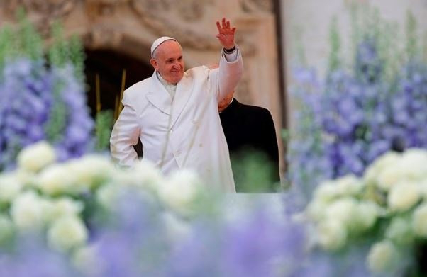 Láthatjátok, hogy ma virágok borítják a teret: a virágok az örömről, az örvendezésről szólnak. Egyes helyeken a húsvétot „virágzó húsvétnak” is hívják, mert kivirágzik a feltámadt Krisztus: ő az új virág, kivirágzik megigazulásunk, virágba borul az Egyház életszentsége. Ezért van itt ilyen sok virág: az örömünket fejezi ki. Egész héten a húsvétot ünnepeljük, egész héten. Ezért köszönjük egymást továbbra is az „áldott húsvétot” jókívánsággal. Mondjuk közösen: „Áldott húsvétot!” Mindnyájan! [Együtt mondják: „Áldott húsvétot!”] Szeretném, ha áldott húsvétot kívánnánk a szeretett Benedek pápának is – hiszen Róma püspöke volt –, aki néz minket a tévében. Kívánjunk Benedek pápának, együtt, áldott húsvétot! [Együtt mondják: „Áldott húsvétot!”] És egy nagy tapsot; erőset!