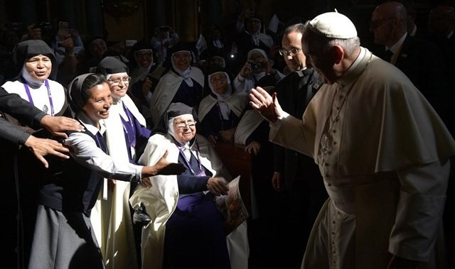 Fontos, hogy mindennap újítsátok meg annak az örömét, hogy megkaptátok Istentől a fogadott gyermekség lelkét, főleg azokban a pillanatokban, amikor az öröm látszólag tovaszállt – mondta a szerzetesnőknek a Szentatya. – Közösségi és személyes imáitok alkotják szemlélődő életetek középpontját. Imátok mindig missziós jellegű, nem pattan vissza a kolostor faláról, hanem kilép falai közül, és tovább halad.