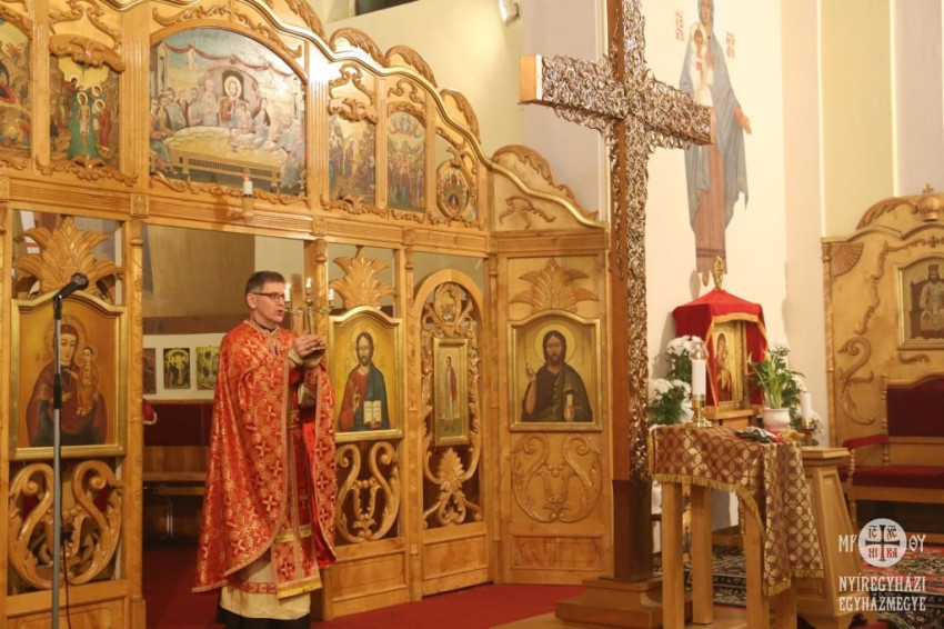 Az este hat órától kezdődő második Előszenteltek Liturgiáján is megtelt a templom hívekkel. Ez egyúttal lelkigyakorlatos alkalom is volt (a másnapi délelőtti szertartással együtt), melyen Ivancsó Sándor nyírcsaholyi parókus mondott homíliát. Az életadó kereszt és az örök életre szóló táplálék, az Eucharisztia összefüggéseiről beszélt. „A kereszt – mint mondta – az elmélet útját mutatja, az Eucharisztia, melyet magunkhoz veszünk, a gyakorlati segítséget adja ahhoz, hogyan is juthatunk az Istenhez. Az Isten közelébe emelkedhetünk a kereszttel, de hogy ezt meg tudjuk tenni, táplálkoznunk kell.” A kereszt, a lépcső, a létra a föld és az ég összekötőjeként az Úrhoz vezető jelképek. Az Ószövetségből Jákob álmában is az életet, Isten jóváhagyását, megerősítését jelenti. Ő mondja, s vele együtt mi, akik itt állunk, mondhatjuk: „Az Úr van ezen a helyen” – fogalmazott a nyírcsaholyi parókus.