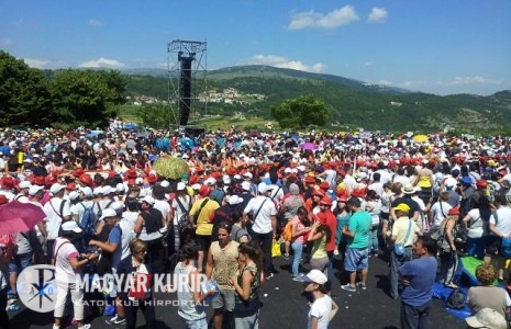 A Fájdalmas Szűzanya kegyhelye előtt gyűltünk össze, amely azon a helyen épült, ahol ennek a földnek két leánya, Fabiana és Serafina, 1888-ban Isten Anyja látomásában részesült, miközben a földeken dolgoztak. Mária mindig segítségünkre siet: amikor dolgozunk, amikor munkát keresünk; legyenek bár világosak vagy zavarosak gondolataink; amikor imánk spontán fakad szívünkből, és akkor is, amikor szívünk sivár. Sok-sok férfi és nő, fiatalok és idősek fordultak Máriához, Isten és a mi anyánkhoz, az Egyház anyjához, hogy köszönetet mondjanak neki vagy kegyelemért könyörögjenek hozzá. Mária Jézushoz vezet el bennünket, és Jézus adja meg nekünk a békét. Forduljunk Máriához bizalommal, kérjük segítségét bátran és reménnyel. Az Úr áldjon meg mindnyájatokat – fejezte be a fiatalokhoz intézett beszédét Ferenc pápa, majd közösen elimádkozta velük az Üdvözlégy Máriát.