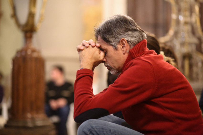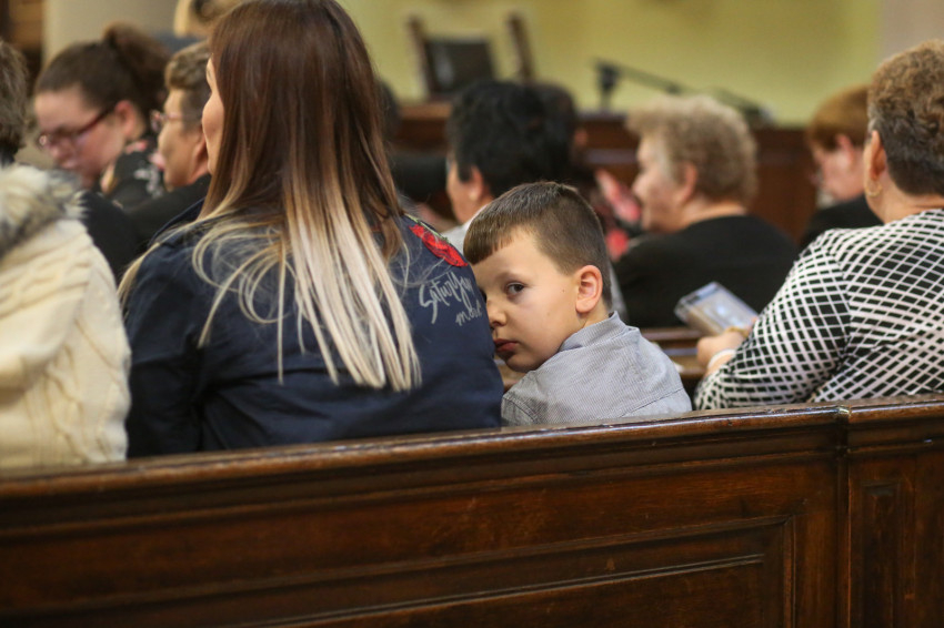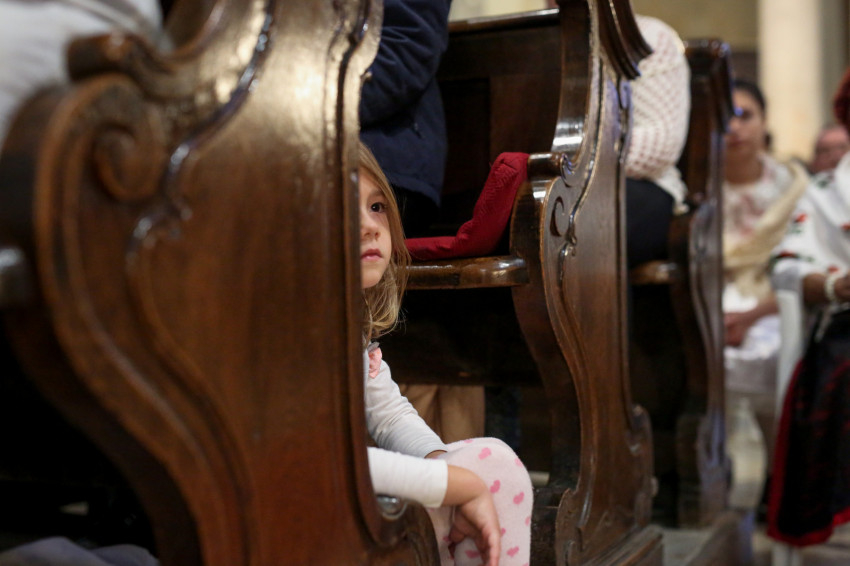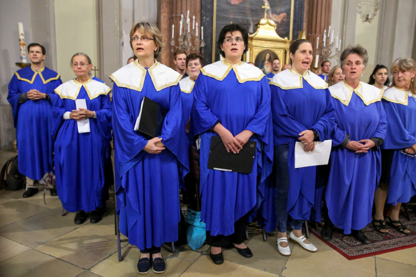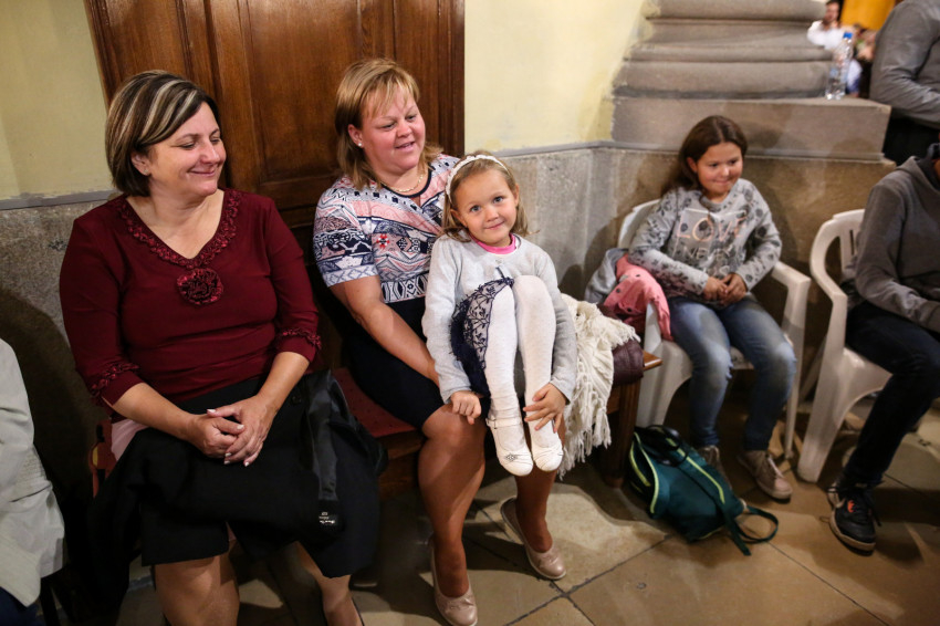 Fél hat után érkezem, előttem két népviseletbe öltözött lány és virágokkal kihímzett fekete pelerint viselő anyukájuk lép be a templomba. Nagyjából minden pad tele van már, de nincs zsúfoltság. Egy oltár melletti korlát aljának párnás szegélyére ülök, amelyet egyébként feltehetőleg az ide imádkozni térdelők szoktak használni. Kissé aggódom, nem tekinti-e valaki ezt tiszteletlenségnek, mert ekkor még csak én merem ezt a forgalomból amúgy kieső helyet választani.