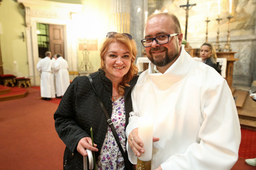 Nagy örömmel vesszük észre egymást Oszwald Ágival, akit még az Antióchiából ismerek. Akárcsak a férjét, Haszara Jancsit, akit épp most avattak akolitussá. A következő percekben rá várakozunk a sekrestye bejáratánál, de hiába, mert közben ő a többiekkel az oltárnál fényképezkedik. Amikor végül magunkhoz integetjük, János kissé ijedt arccal konstatálja, hogy írni akarok róla, de gyorsan megnyugtatom, hogy nekem elég az is, ha csak gratulálok, nem akarom elrontani nekik ezt a szép estét. Örömmel látom, hogy ettől megnyugszik, sőt már ő nyugtatgat engem: pár szót szívesen mond a dologról.