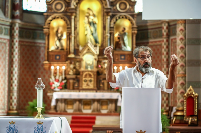 Az áhítat után következett Eperjes Károly előadása. A Kossuth- és Jászai Mari-díjas művész színészi, profetikus előadásában költői asszociációk és teológiai igazságok váltakoztak az Isten misztériumára figyelő hívő szemével egybelátott rendben. Az előadás mozaikszerűen épült fel a Szűzanya személye, az Eucharisztia, magyarságunk és megmaradásunk nagy témáiból.
