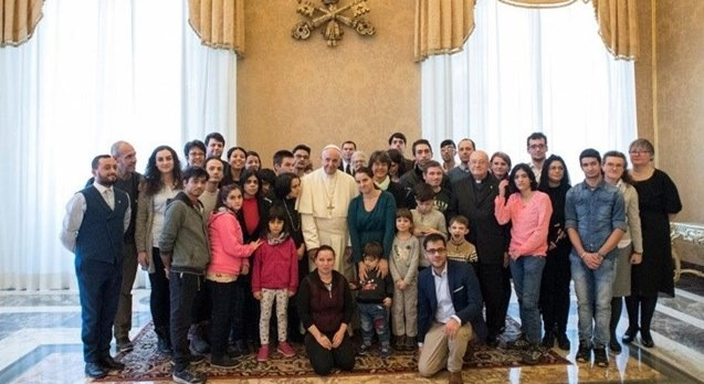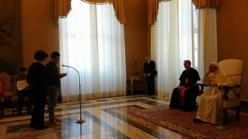 A csoportban voltak fiatalok, gyerekek és fiatal szülők is, az FDP csoport (FDP protagonisti nell’educazione) elnevezésű civil szervezet vezetője kísérte el őket. Húsz éve vette fel az olasz szervezet a kapcsolatot egy bukaresti árvaházzal, azóta kísérik figyelemmel az ott felnőtt fiatalok sorsát. Kérdéseket tettek fel a pápának életről, halálról, betegségről, bűnről, a fájdalomról, ami abból fakad, hogy szüleik elhagyták őket, a tartós kapcsolatok kialakításának nehézségéről és arról, hogy olykor nehéz elfogadni az Egyház válaszait, amelyekkel sokszor inkább falakat, mint hidakat épít.