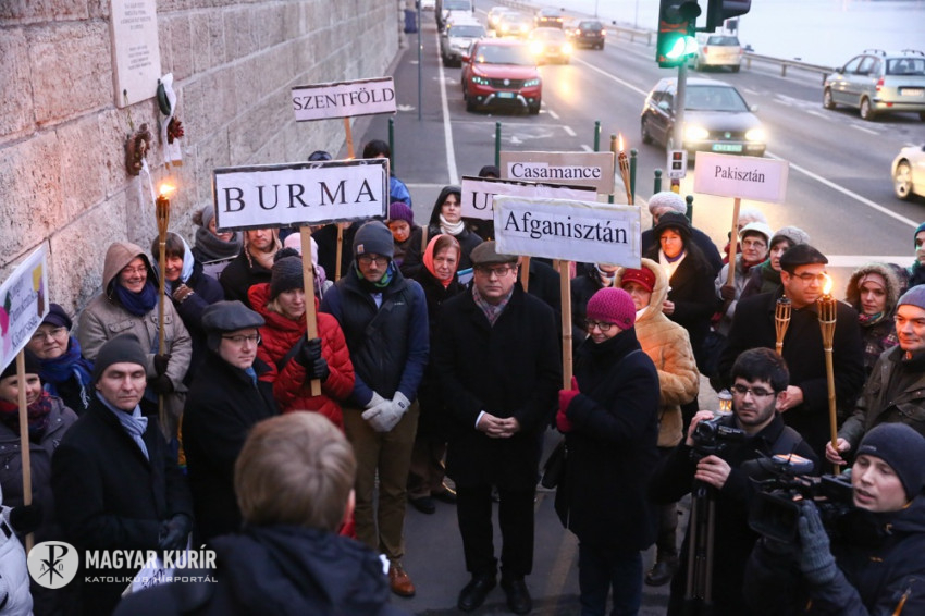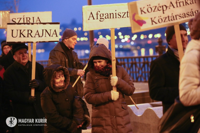 A résztvevők Budapesten a Salkaházi Sára rakparton, a vértanú szerzetesnővér emlékét őrző márványtáblánál gyújtották meg mécseseiket. Szőke Péter, a Szent Egyed közösség magyarországi vezetője felolvasta az Irgalmasság nagyobb, mint a közöny című békekiáltványt, amellyel közösségük csatlakozik Ferenc pápa szándékához. „Miközben a béke lépésével kezdjük az új esztendőt itt és a világ megannyi pontján, szeretnénk, ha Ferenc pápa felhívása meghallgatásra találna: »váljon az irgalmasság, a szolidaritás valódi életprogramunkká«. Vállaljuk, hogy ezt tettekre váltjuk azokból kiindulva, akiket Ferenc pápa üzenetében megjelöl: »az idegenekből, betegekből, foglyokból, hajléktalanokból«” – szóltak a felhívás szavai. A rakpartról a menet a Váci utcai Szent Mihály-templomig vonult fáklyákkal, mécsesekkel és transzparensekkel, amelyeken a háború sújtotta országok nevei szerepeltek.