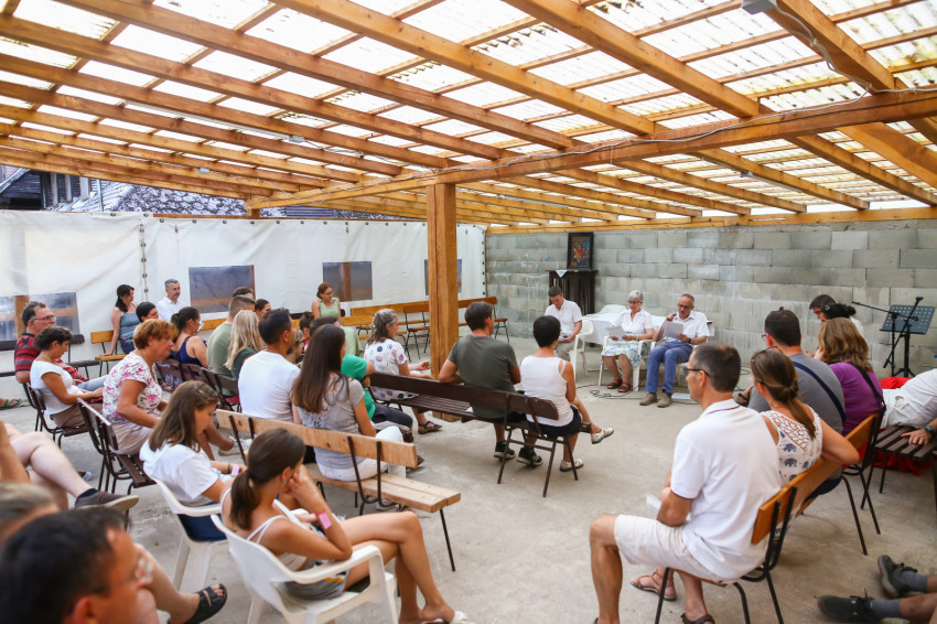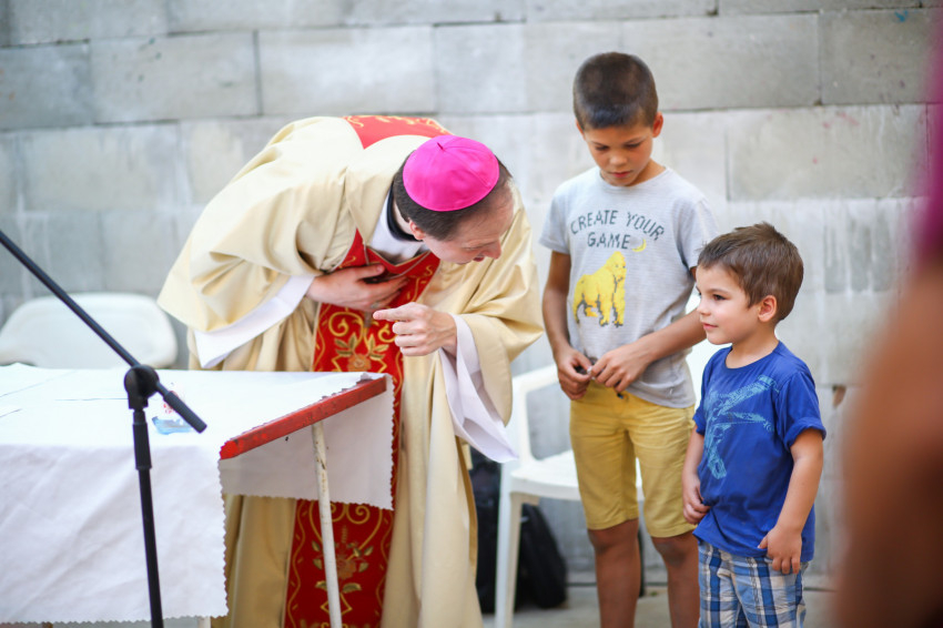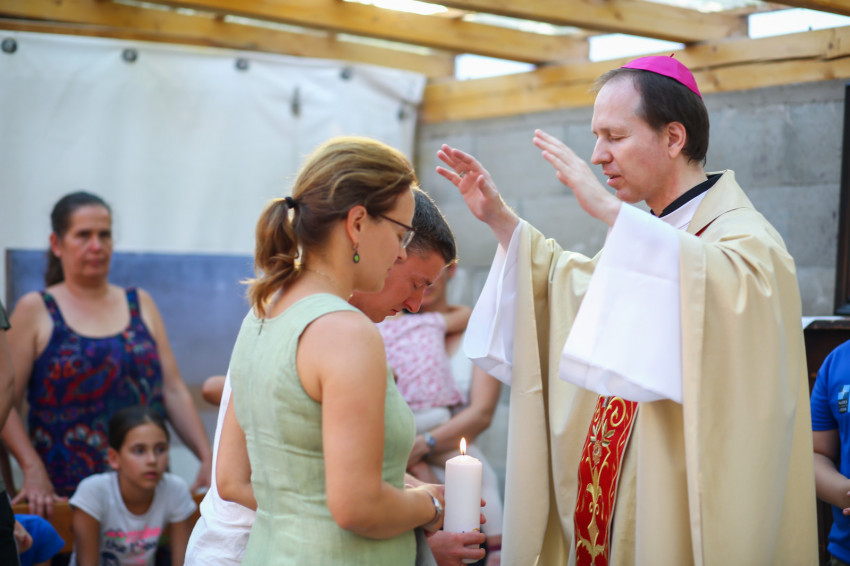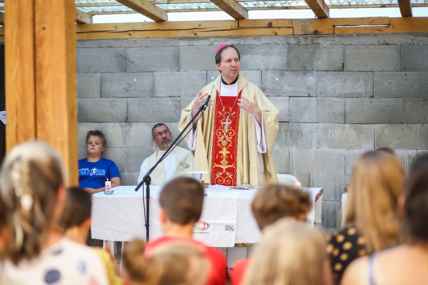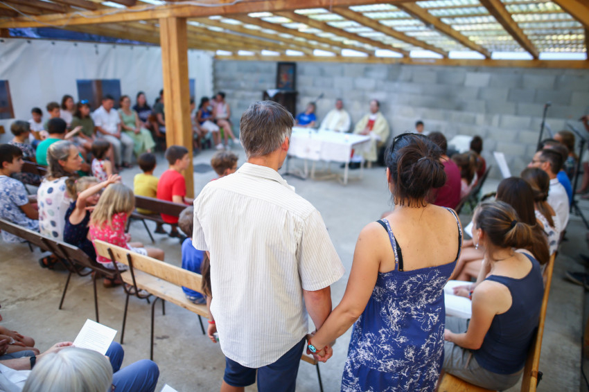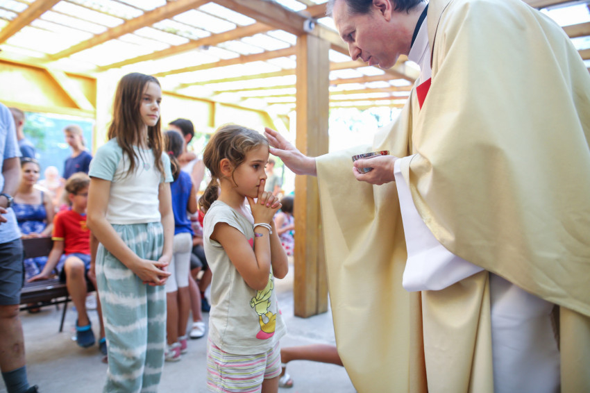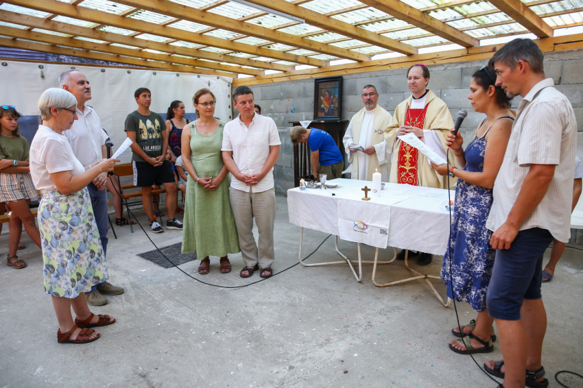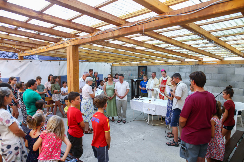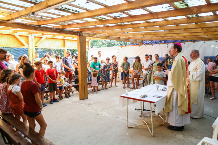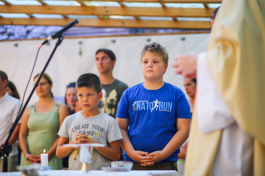 A Vácról, Dunaharasztiból, Gyömrőről, Debrecenből és Déváról érkezők szentmisére várják Mohos Gábor esztergom-budapesti segédpüspököt. A szabadban ünnepeljük Szűz Mária mennybevételét. A tető árnyékot ad, de a levegő áll. Sok a kisgyerek, nehezen megy az elcsendesedés.