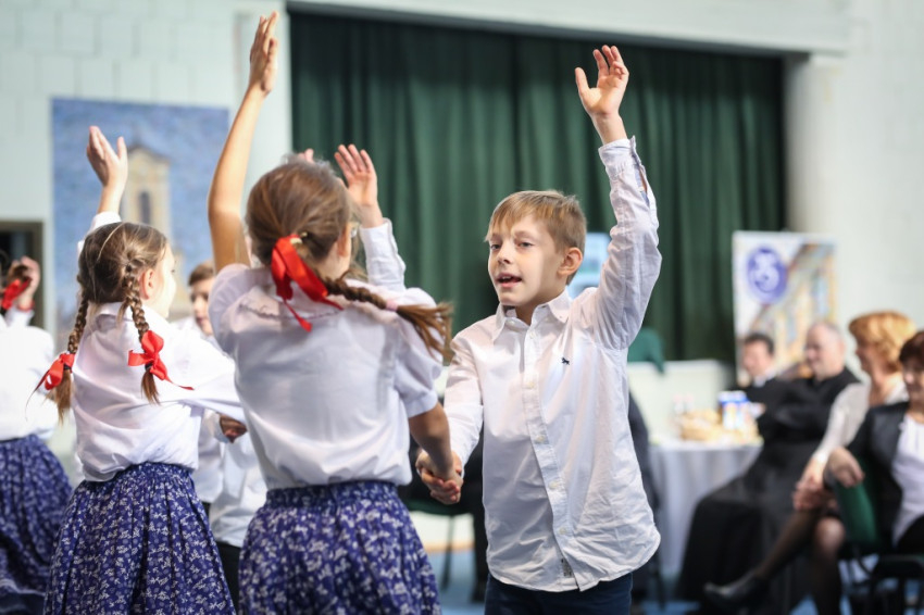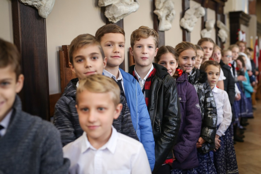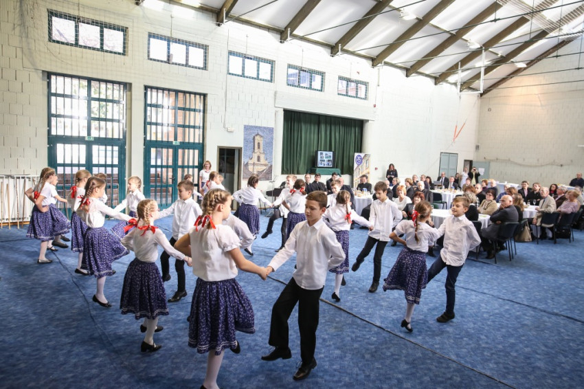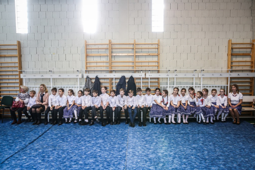 Mise után átmegyünk az iskolába, és a feldíszített tornateremben, szűkebb körben folytatjuk az ünneplést. A gyerekek közül csak az műsor közreműködői tartottak velünk, az alsósok ugyanis most kézműveskednek, a felsősök pedig játékos vetélkedőn vesznek részt.