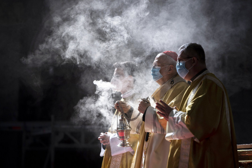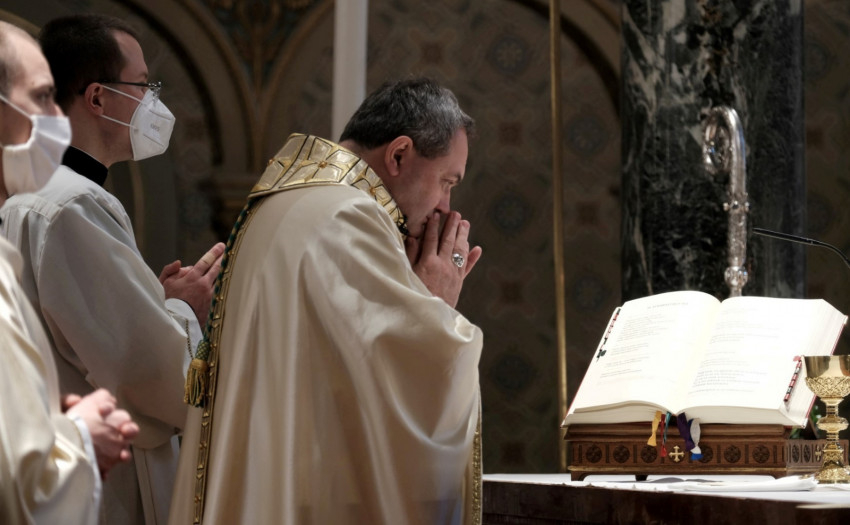 Erdő Péter bíboros, prímás, esztergom-budapesti érsek sine populo, azaz hívek jelenléte nélkül mutatta be a húsvéti ünnepi szentmisét április 4-én délelőtt az esztergomi bazilikában.