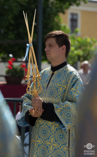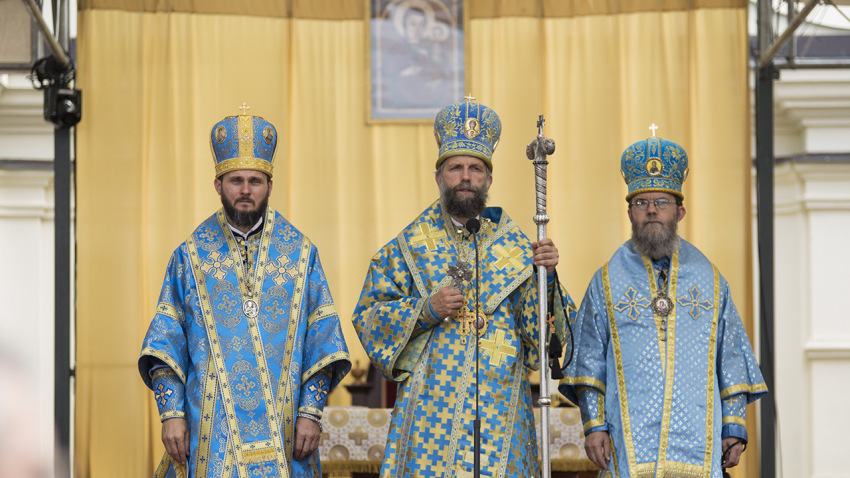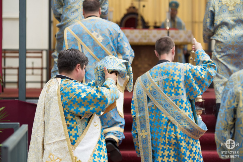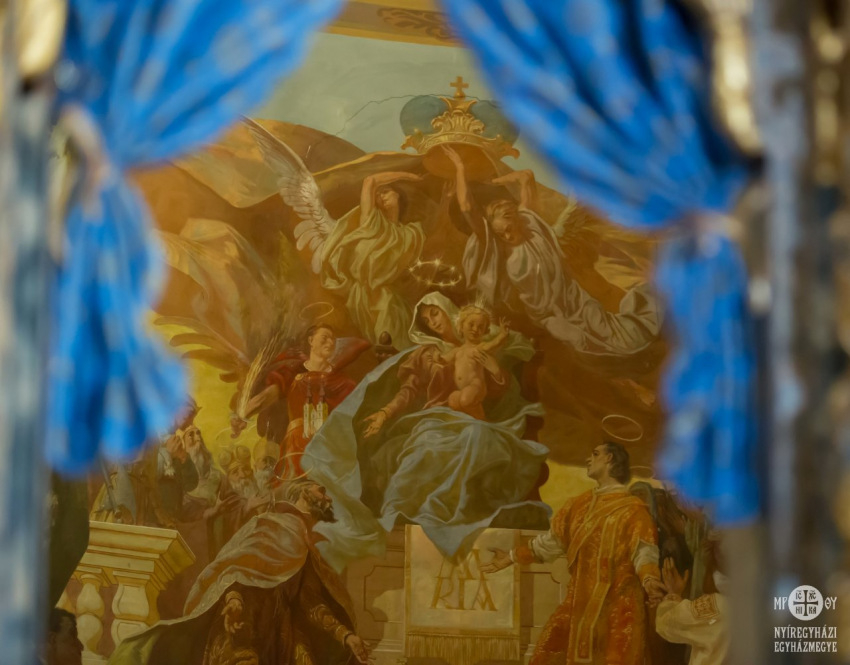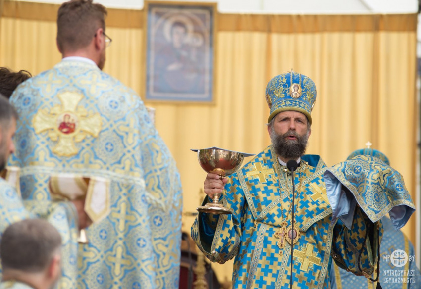 Kékbe öltözött a máriapócsi kegyhely augusztus 18-án. A templombelső terítői és a búcsúi Szent Liturgián jelen lévő püspökök, papok, szerpapok, alszerpapok arannyal ékesített kék öltözékben, Szűz Mária színében ünnepeltek.