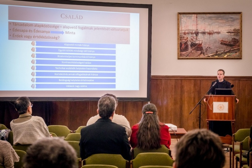Nem vagyok sem pszichológus, sem házasságterapeuta. Mégis miért szól bele a pap a magánéletbe? Hogyan beszélhet a családról, gyermekvállalásról, hiszen nem él családban és nem nevel gyerekeket? De vajon egy orvosnak betegnek kell-e lennie ahhoz, hogy tudja gyógyítani a betegséget? Az Egyház rendelkezik egy olyan tapasztalattal – akár a hagyományból, akár az örömhírből merítve –, ami által hozzá tud szólni ezekhez a témákhoz. A kereszténység nem izolált dolog, van egy kétezer éves tapasztalata. Ha úgy fogjuk fel Jézus Krisztus örömhírét, hogy az életalakító valóság, akkor az élet ezen dolgaiban az Egyház tud tanácsot adni, tudunk segíteni, tudunk szempontokat adni, irányt, értékrendet mutatni. Nem tudunk viszont kinyilatkoztatni – vezette be előadását Mihályi Jeromos.