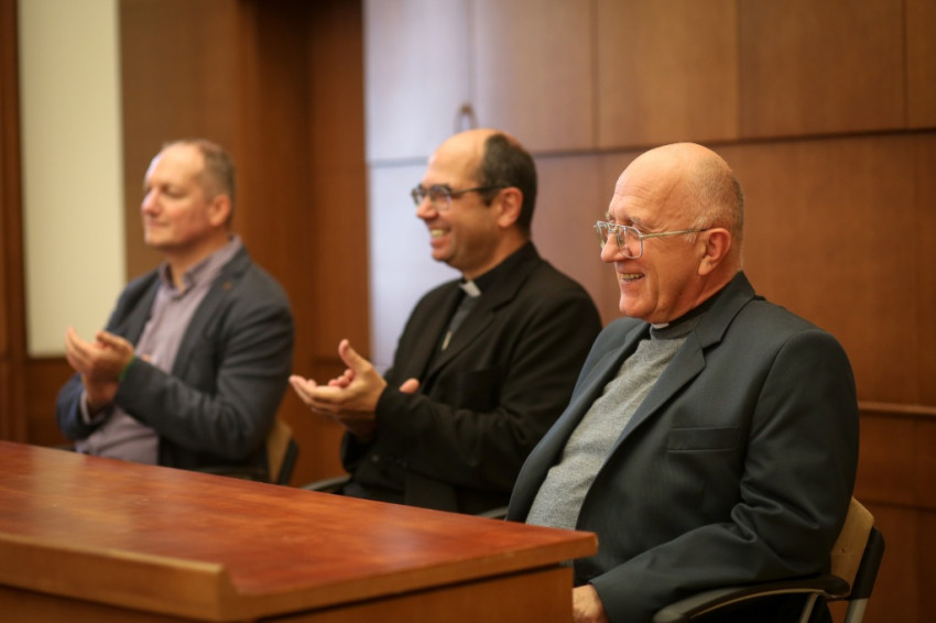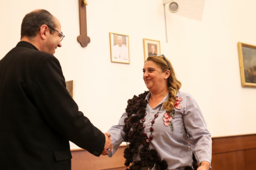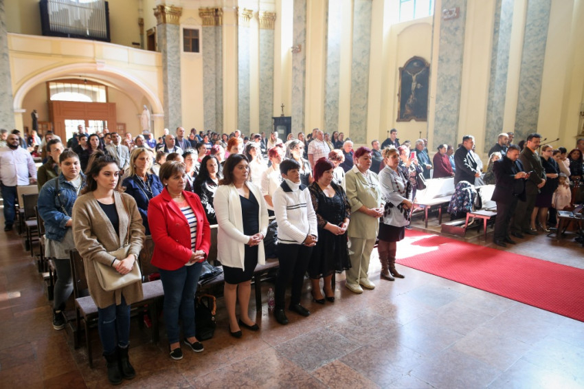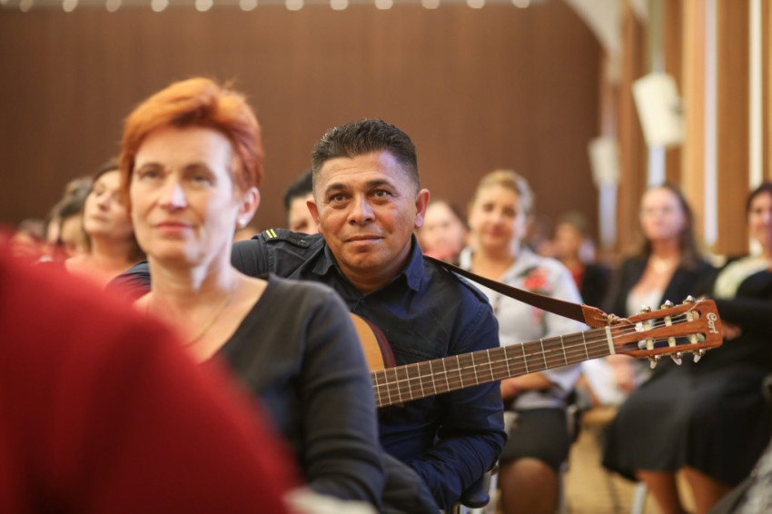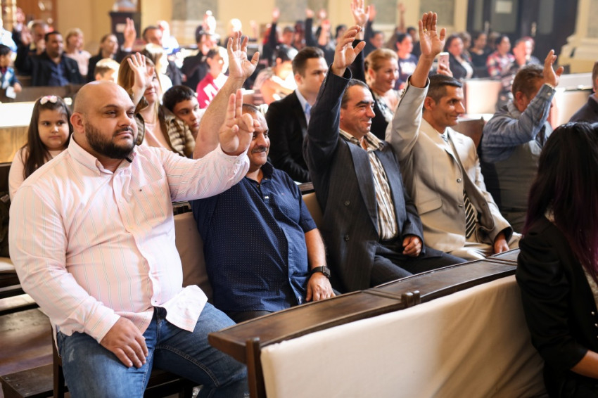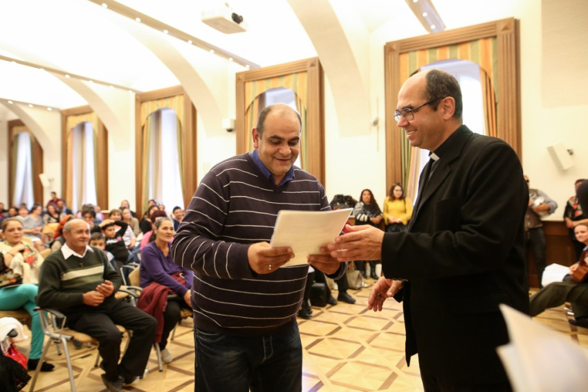 Mise után átvonulunk a Szent Adalbert Központba. Várakozunk a díszteremben, az egyik résztvevő gitározik és énekel: „Több erőt, több szeretetet tőled mindennap.” Aztán Farkas Gábor, a képzés szervezője üdvözli a megjelenteket, és elmondja: idén másodszor adnak át lelkipásztori munkatársi tanúsítványokat, a kimagasló eredménnyel végzetteknek a közösségszervezői fokozatot. Ötven résztvevő végzett, a legtöbben máriapócsiak, kazincbarcikaiak és esztergomiak, de rengeteg más település lakói is vannak köztük.