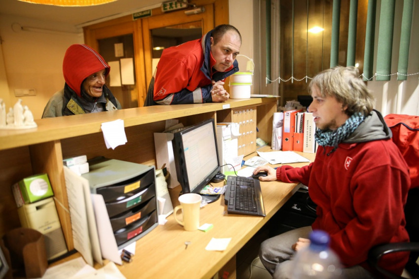 Autóba ülünk, és az M7-es bevezető szakaszához, a korábbi Bécs szálloda épülete mögött, a Rimaszombat utcában levő nappali melegedőbe megyünk, amely most tizenöt fős éjszakai menedék is. Itt azonban épphogy csak körülnézünk, aztán a vezetővel, Biró Péterrel és Emíliával már indulunk is a közelben álló épületbe, amely régebben kollégiumnak adott otthont, de már jó ideje üresen áll, és halljában a máltai szeretetszolgálat három éve krízisszállót üzemeltet a téli hónapokban. – Elvileg nyolcvan férőhelyes, de valamelyik este százheten aludtak benne – tudjuk meg Pétertől.