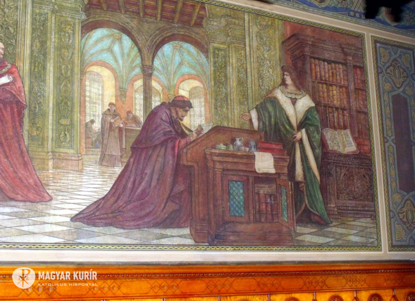 Az első emeleti freskók a független magyar állam középkori történetének fontos pillanatait jelenítik meg. Az egyik legszebb kép az, amelyen Szent István király megalapítja a pannonhalmi apátságot. Nagy királyunk még trónra lépése előtt alapította a Szent Márton-hegyi monostort, amely a bencés rend magyarországi központjaként mind a mai napig kiemelkedő szerepet játszik a hazai kulturális és hitéletben. Egy másik fontos eseményt ábrázoló falikép címe: III. Béla király elrendeli a hivatali írásbeliséget. Ez csupán két meghatározó freskó az első emeletről, de a többi is figyelemre méltó.