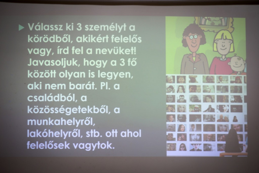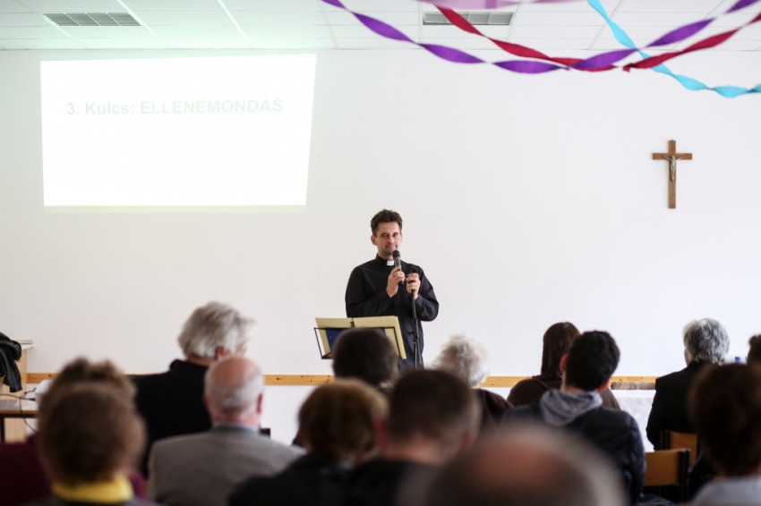 Fontos, hogy akarjuk érteni a gyerekeinket, kapcsolódjunk hozzájuk, hangzik el. Ahogyan az is, hogy legyenek fórumok, amelyeken a magunkról, családunkról, házasságunkról való tudásunkat gyarapíthatjuk. Tetszik, hogy az előadók mindannyiunkat bevonnak a közös gondolkodásba: kapunk egy-egy papírt, amelyre azok nevét írhatjuk, akikért felelősek vagyunk, majd megválaszolhatunk velük kapcsolatban néhány lelkiismeretet ébresztő kérdést. Milyen jelét adtam mostanában irántuk való szeretetemnek? Imádkozom-e értük? Tudom-e, mi mozgatja őket, melyek a számukra legfontosabb értékek? Aztán arról beszélgetünk egy kicsit, hogyan lehet az erőszakot – a verbálisat is – kitessékelni a családok életéből.