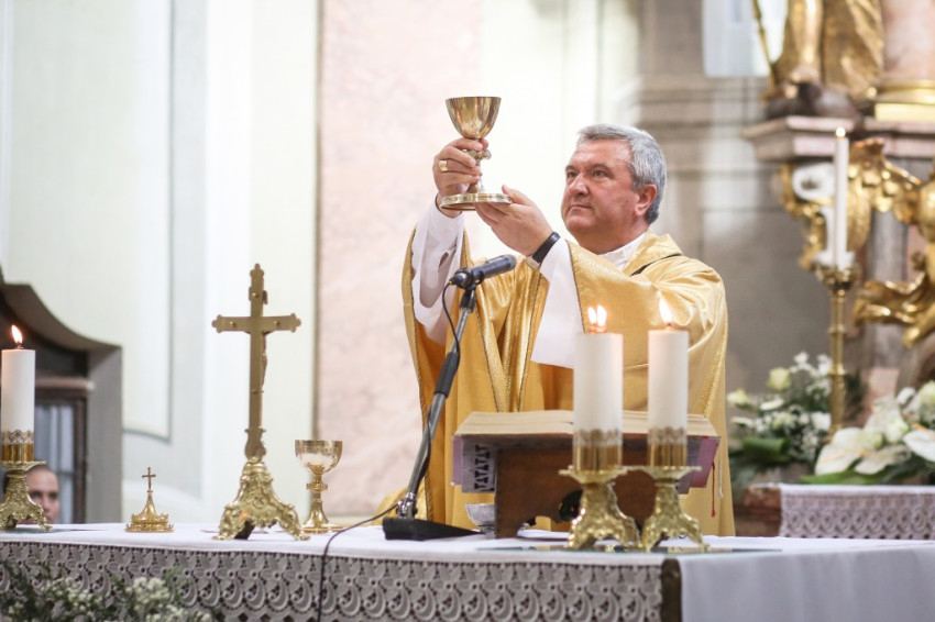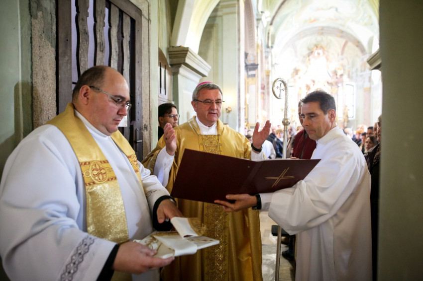 De miként került Mosonmagyaróvárra Szent Gotthárd? Erre a kérdésre a templom története adja meg a magyarázatot. A Karoling-korban a településnek székesegyházszerű kőtemploma volt, melynek maradványait az 1930-as évek közepén fedezték fel, a kripta építése során. 1260 után Óváron templom épült, s arról is vannak adatok, hogy a városnak ezen a részén hosszú évszázadokon át két templom állt, egy kisebb és egy nagyobb. Az előbbit Szent László-kápolnának nevezték. A törökök kiverése után a nagyobbik templomot, amelyet német iparosok és kereskedők igyekeztek helyreállítani, az Alsó-Bajorországból származó Szent Gotthárd tiszteletére szentelték. Így már érthető, hogy a középkor egyik leghíresebb szentjének tisztelete miként került magyar földre. Ennek a templomnak a hívei ünneplik hát a felszentelés 350. évfordulóját, s ebből az alkalomból mondott ünnepi szentmisét Veres András püspök. Mivel a pápai dekrétum teljes búcsút engedélyezett a híveknek, az általános gyónás befejezéseként a szokásostól eltérő imádságot mondott a főpásztor.