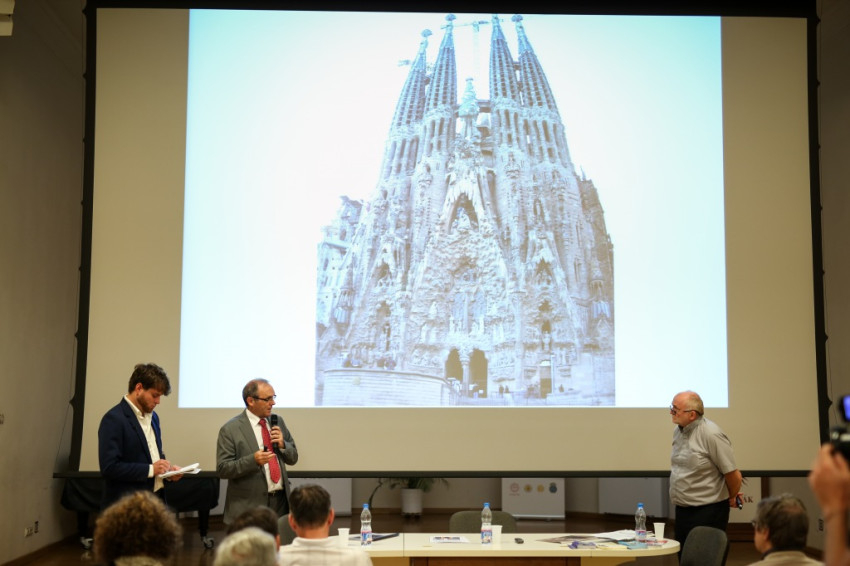 A templom egyes elemeit bemutatva az előadó kifejtette: eredetileg egy tornya lett volna, de Gaudí tizennyolcat tervezett. Tizenkettőt a 12 apostolnak, négyet az evangelistáknak, egyet-egyet Szűz Máriának és Jézusnak. Tisztában volt azzal, hogy az ő életében nem fognak befejeződni a munkálatok, ezért a tervezésnél világossá akarta tenni az utókor számára, hogy mik az elképzelései. Gaudí tervei szerint az összes többinél magasabb, Krisztust jelképező fő tornyot koronázó és egyben lezáró keresztből erős fénysugarat kellett volna a városra bocsátani, amely az embereket megvilágítva illusztrálja a krisztusi szavakat: „Én vagyok a világosság.”