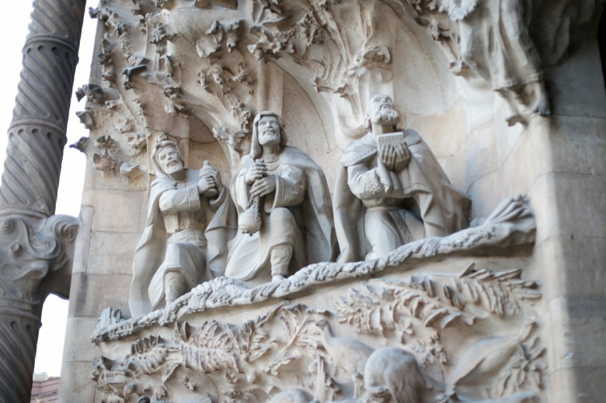 A három templomkapu közül a legnagyobb a középső, a „Szeretet Kapuja.” Krisztus születését látjuk rajta, a szeretet szimbólumával, egy pelikánnal, akiről köztudott, hogy vérével táplálja a fiókáit – ez utalás egyúttal az Oltáriszentségre is. Ettől balra esik a „Remény Kapuja”, amelyen Jézus gyermekkorának két drámai eseménye, a betlehemi gyermekgyilkosság és az Egyiptomba menekülés kapott helyet. Végül a főkaputól jobbra esik a „Hit Kapuja”, a Jelenések Könyvéből vett bibliai jelenetekkel. Szimbolikus magyarázata van annak, hogy a reményt keltő motívumokat miért a keleti homlokzatba faragták. „Ex oriente lux”, azaz Keletről jön a fény, s vele az üdvözülés. Krisztus szenvedései az ellenkező, tehát a nyugati oldalra kerültek, vagyis oda, ahol a Nap lenyugszik. A keleti homlokzat harangtornyainak spirálisan felfelé tartó nyílásai között a „Sanctus, Sanctus, Sanctus” olvasható, amely felfelé vonzza a tekintetet, úgy hat, mint vidám örömujjongás az Ég felé.