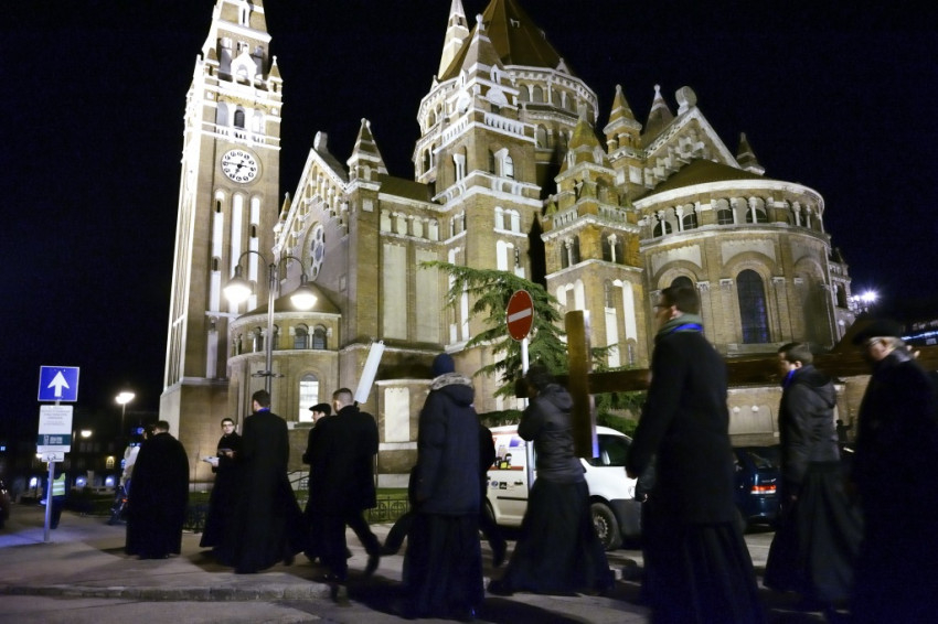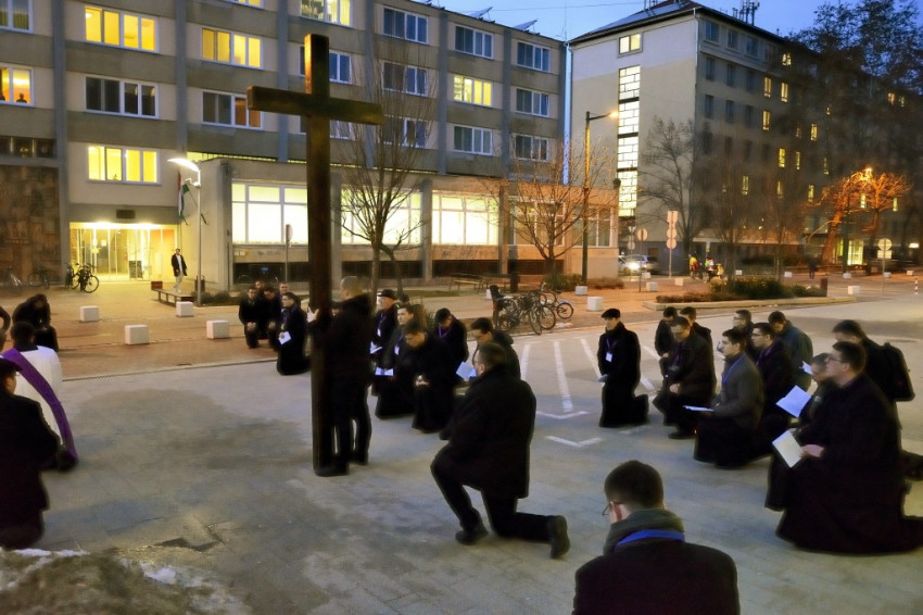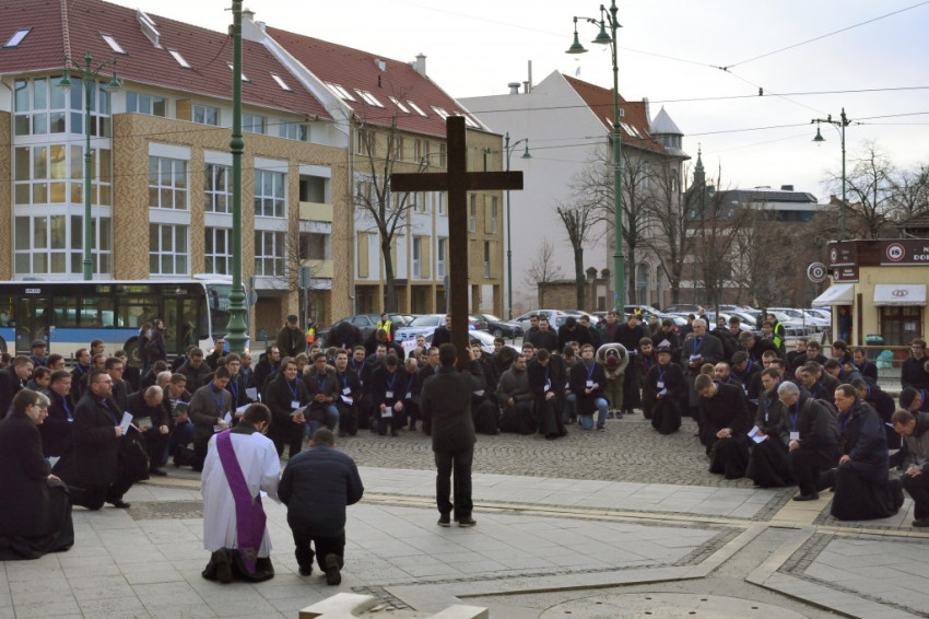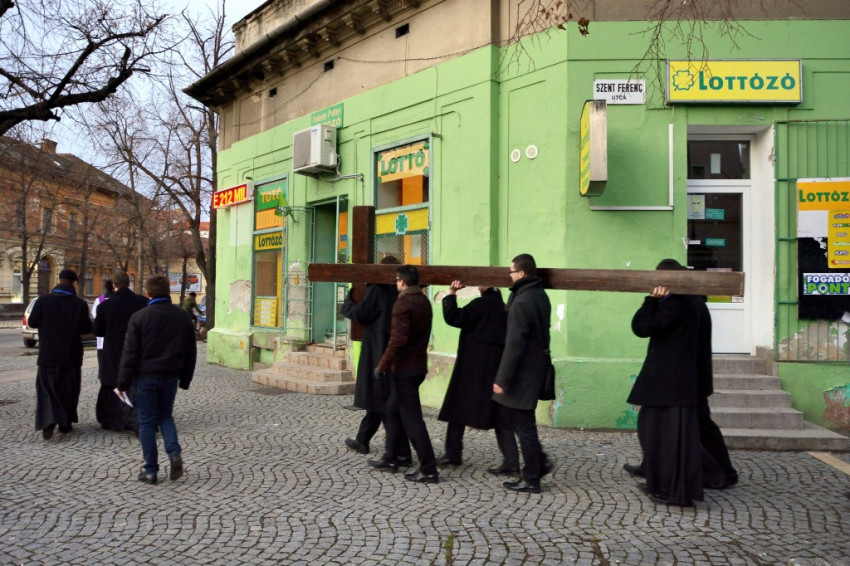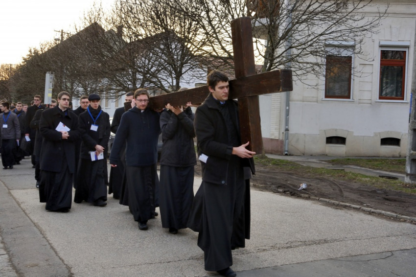 Miközben a rektorral erről beszélünk, a kispapokkal együtt többek között a szegedi pályaudvart, az egészségházat és a Tisza-partot érintjük – láthatólag evangelizációs, missziós célokat is szolgál a keresztútjárás. Az egyik papnövendék oda is lép hozzám egy csodáséremmel, érdeklődik, hogy tudom-e, mi az. Amikor mondom, hogy igen, akkor megkérdezi, hordom-e mindennap, ahogy a Szűzanya kéri, és mivel nemleges a válasz, nekem adja. Az elöljárókkal együtt mintegy kétszáz fekete ruhás férfi, akik miatt még forgalomkorlátozás is szükséges, mindenki figyelmét magára vonja, a bátrabbak meg is kérdezik egy-egy hátramaradó papnövendéktől, hogy mi ez a menet.