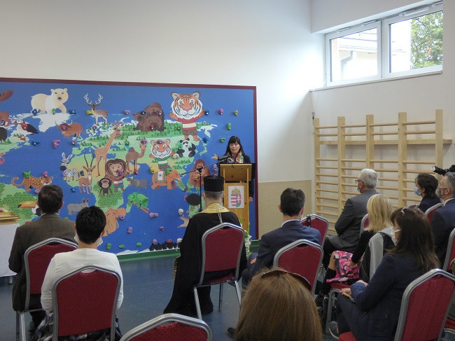 Az új óvoda bejáratát jelképező szalagot Szeiler Orsolya igazságügyi közszolgáltatásokért felelős helyettes államtitkár, Demeter Zoltán országgyűlési képviselő és Orosz Atanáz megyéspüspök vágta át.