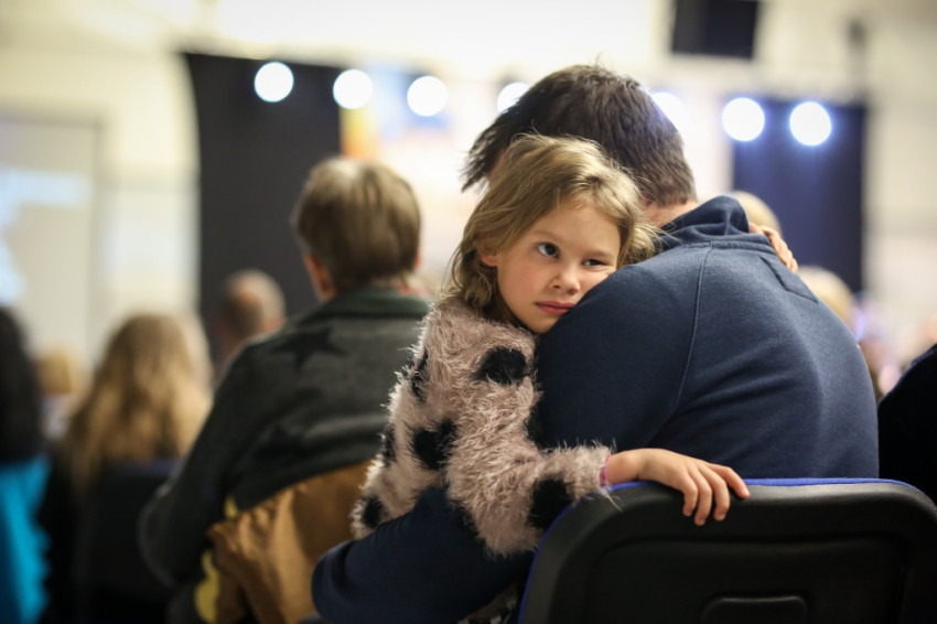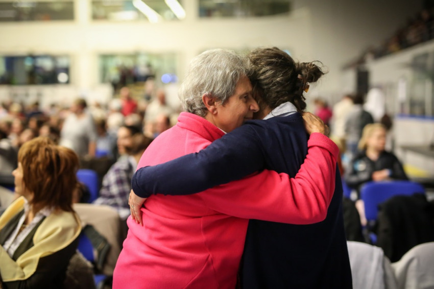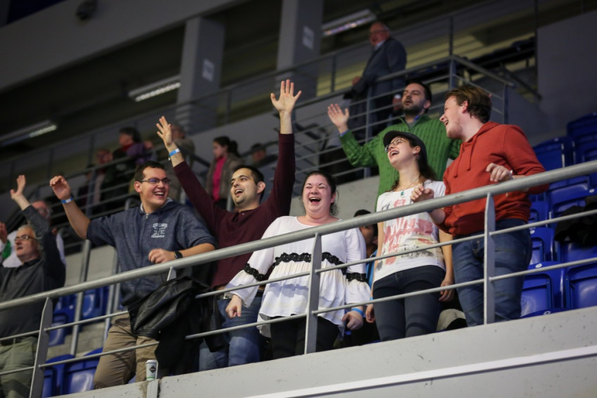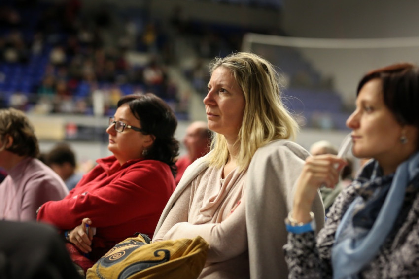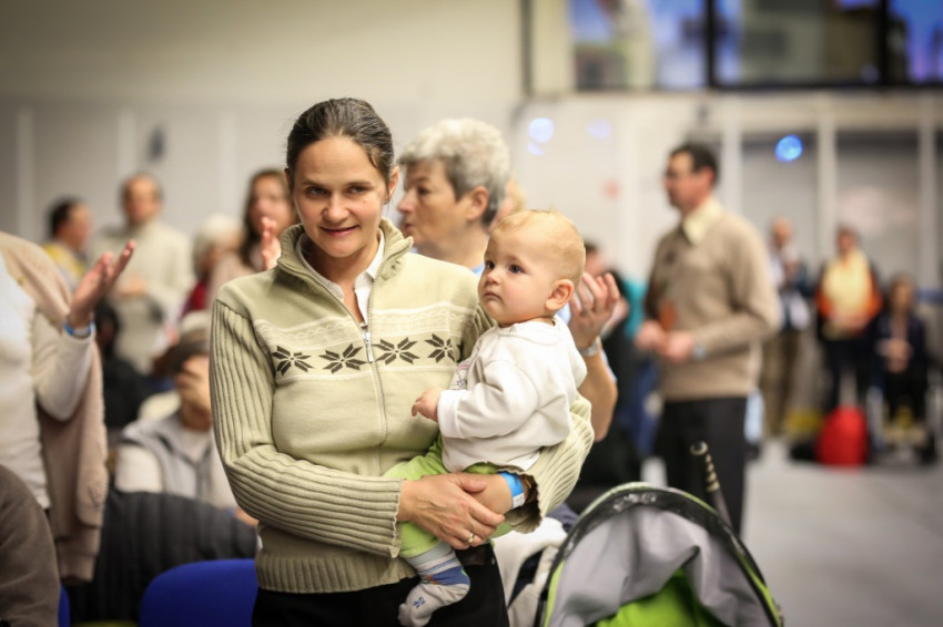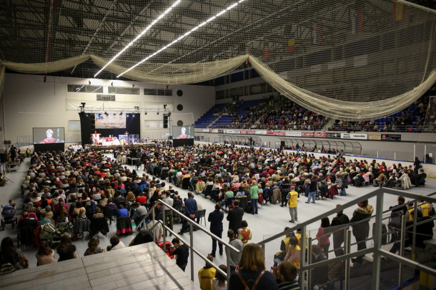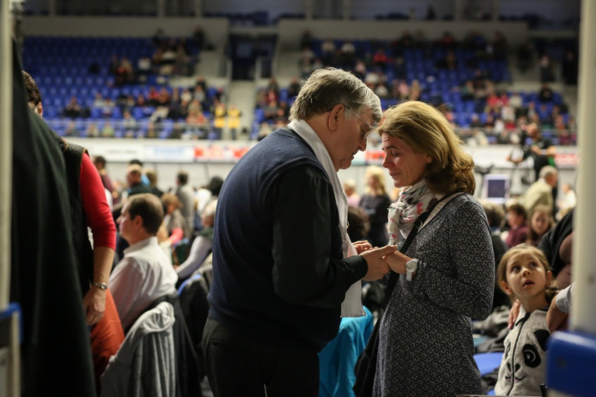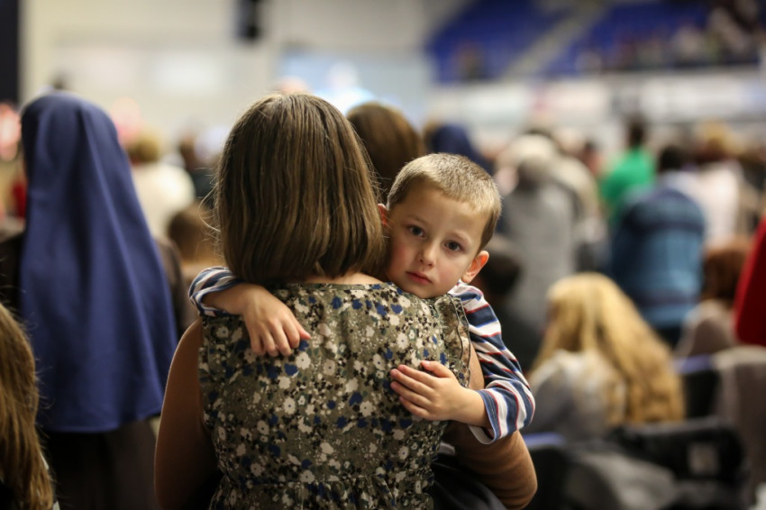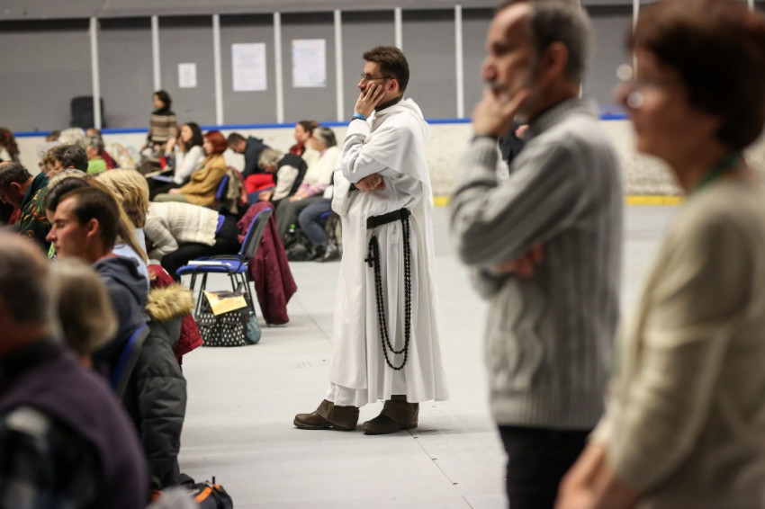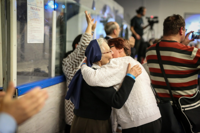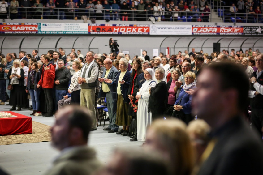 Amikor megkapom a karszalagot, egy nővér éppen az egyik sárga mellényes rendező lány fejére tett kézzel imádkozik a lépcsőn. A csarnok földszintjén minden ülőhely foglalt, és sokan állnak is, a lelátók körülbelül kétharmadán ülnek. Lent anyukák sétálnak karjukban gyerekkel, máshol három-négy évesek játszanak földre terített szivacson, pokrócon, vagy futkosnak ide-oda, manővereznek a sorok között ovis motorral.
