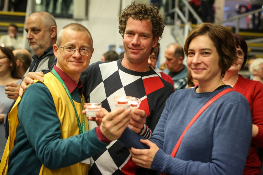 A szünetben az alagsorba, a rendezői központba megyünk. Útközben ilyen feliratokat látunk: „Jégkészítéskor a jégpályán tartózkodni szigorúan tilos”, „A lépcsőházban csak élvédővel szabad közlekedni”. Nem tudom nem jelképesnek tekinteni, hogy ez a találkozó éppen egy „jégcsarnokban” zajlik, míg a Szentlélek jelképe a tűz. Az épület – a kezében korcsolyával közlekedő, gyermeke kezét fogó apuka jelenlétéből ítélve – jelenleg „vegyes üzemmódú”. De a nagycsarnokban most senki sem fázik, az biztos.