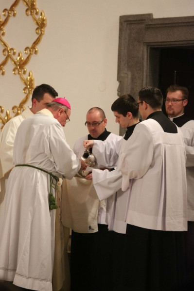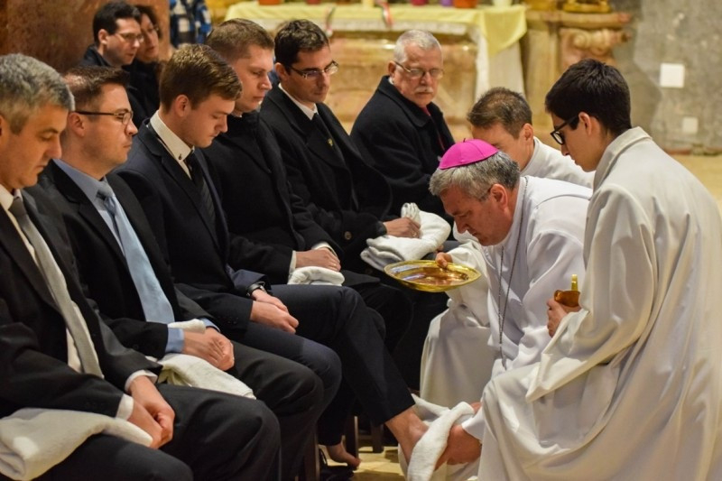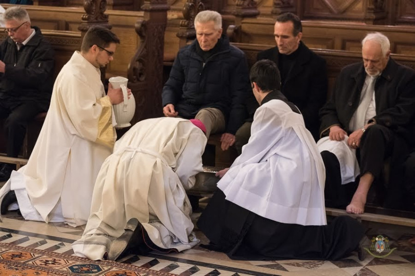 Ezután Krisztus cselekedeteit utánozva levetette felső ruháját, derekára kendőt terített, kezébe kancsót vett és sorra letérdelt papjai elé, megmosta és megcsókolta lábukat. A megjelenített bibliai szakaszokat Mosolygó Béla kancellár olvasta fel, közben a papnövendékek adtak halk kíséretet az Evangélium főszólamának.