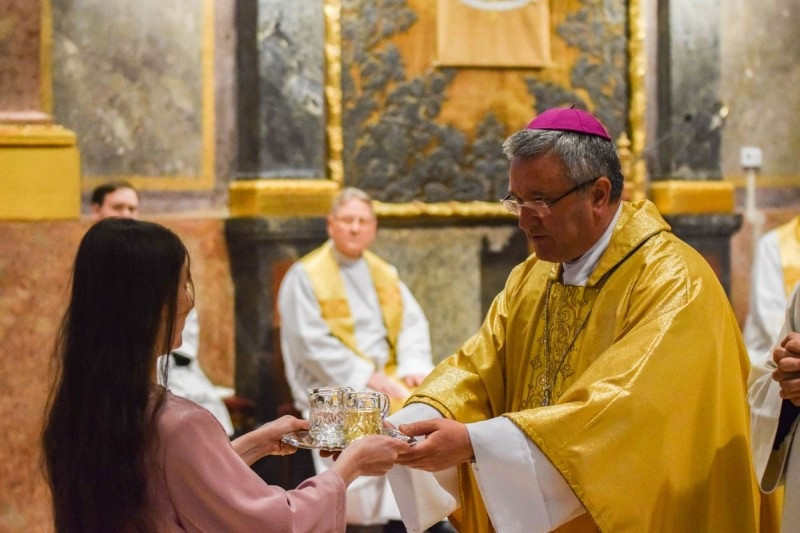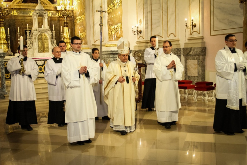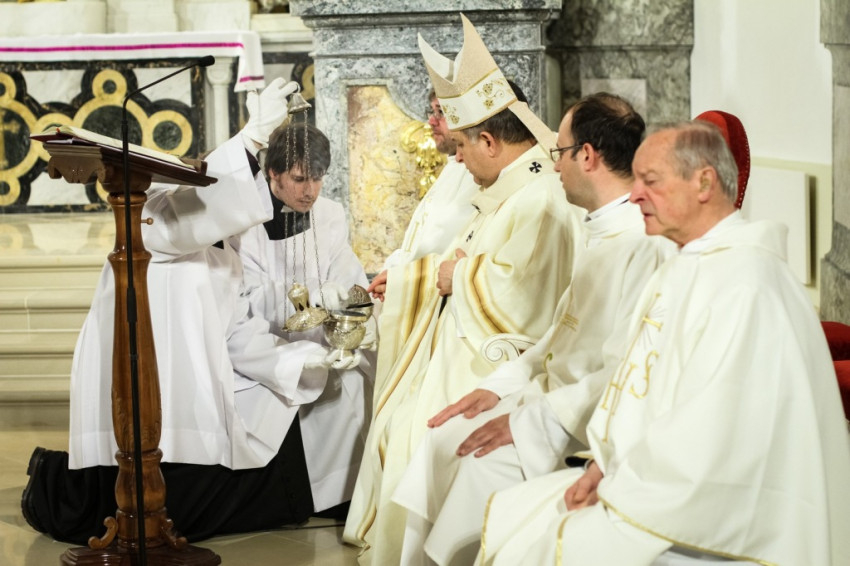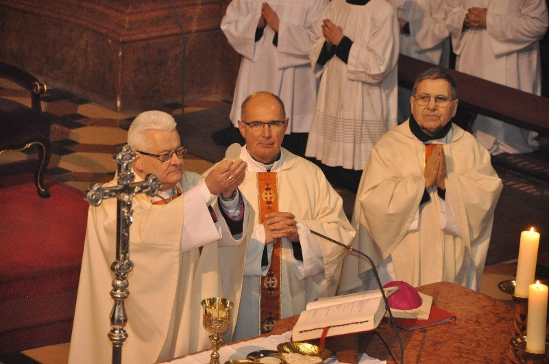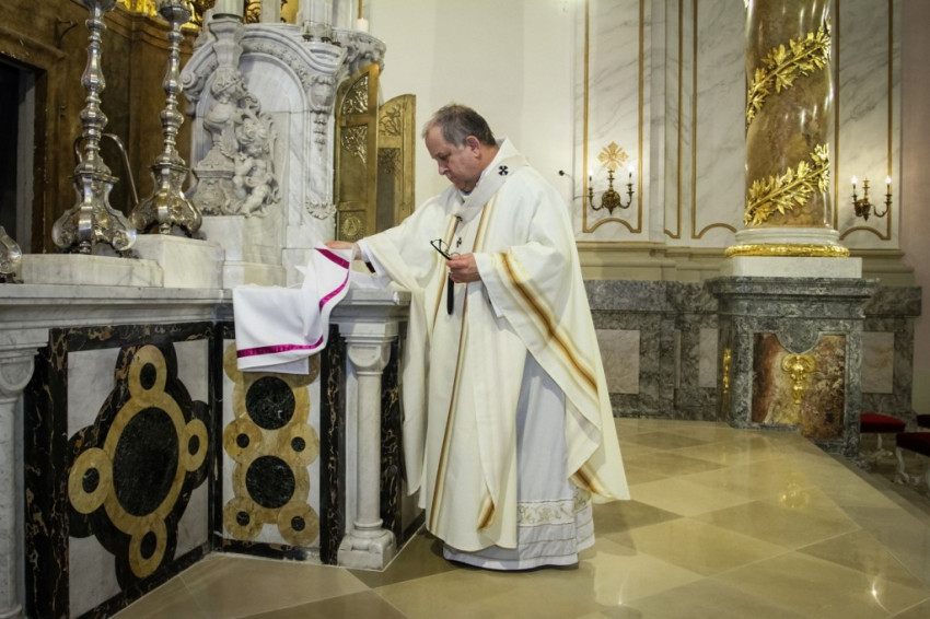Nagycsütörtökön este az utolsó vacsora emlékére mutatott be szentmisét Beer Miklós megyéspüspök a váci székesegyházban.