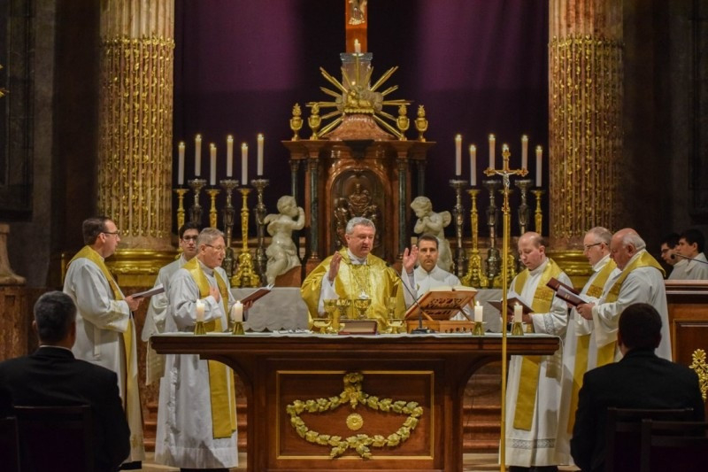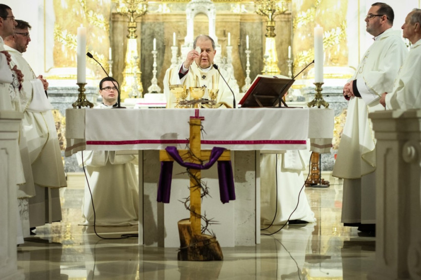 Az utolsó vacsora szentmiséjét mutatta be Márfi Gyula érsek nagycsütörtök este a veszprémi Szent Mihály-bazilikában. Szentbeszédében a főpásztor a kenyér és a bor színe alatt közöttünk élő Jézusról beszélt. Amikor Jézus látható emberi formában elköszön tanítványaitól, nem valamit hagyott itt, hanem Önmagát, a kenyér és a bor színe alatt – hangsúlyozta az érsek. A templom is azzal válik Isten házává, hogy a szentségi Jézus jelen van benne.