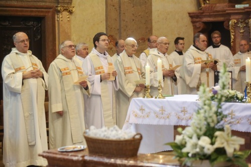 „Szent Benedekhez szálljon fel az ének” – hangzott fel a szentmise kezdőénekeként a Szent Benedek-himnusz. Több száz öregdiák zengő férfihangja töltötte be a templomot. Majd Horváth Dori Tamás köszöntötte az egybegyűlteket.