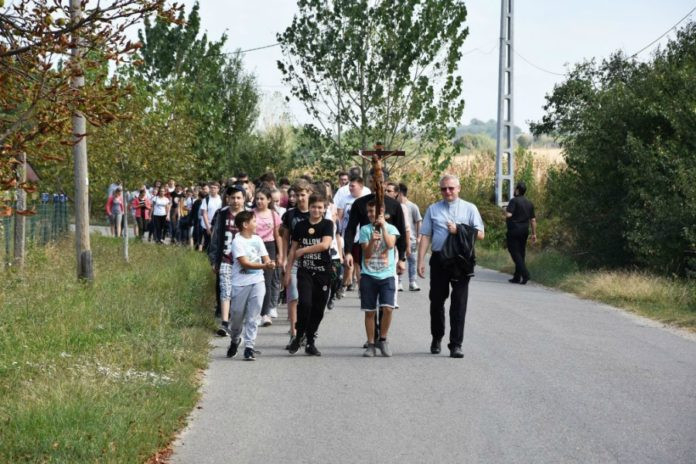 Később az erdészháztól gyalogosan zarándokoltak kísérőikkel, a szervezőkkel és az önkéntesekkel a hegyköztótteleki plébániatemplomba – együtt imádkozva az úton, Böcskei László püspök vezetésével.