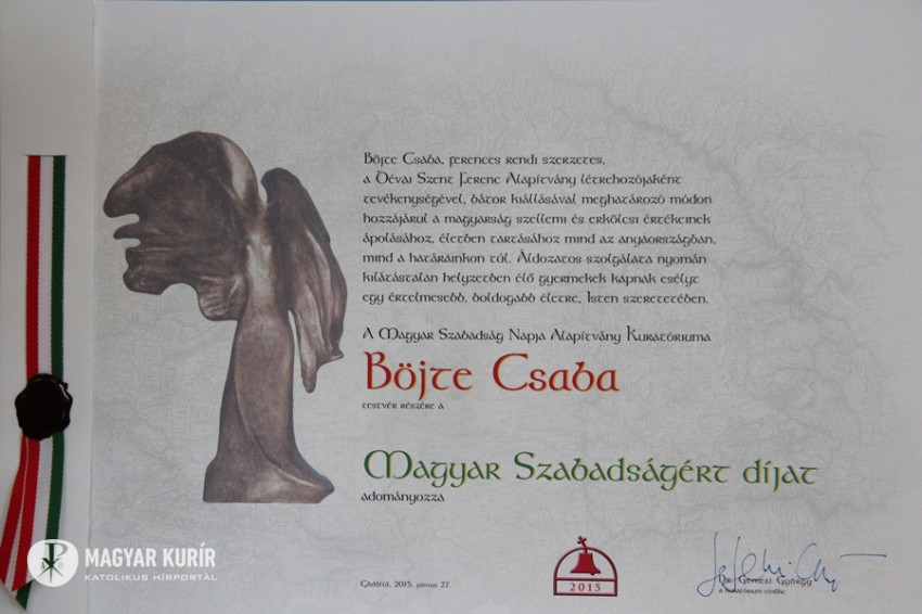 Böjte Csaba, akit a jelenlévők felállva, vastapssal köszöntöttek, a díj átvételekor úgy fogalmazott: „Hiszem, hogy a világunkat a szeretet, a jóság képes szabaddá tenni.” Hozzátette: a gyűlöletet, a sötétséget, a butaságot kell legyőzni, mert azok roncsolják a szabadságot.