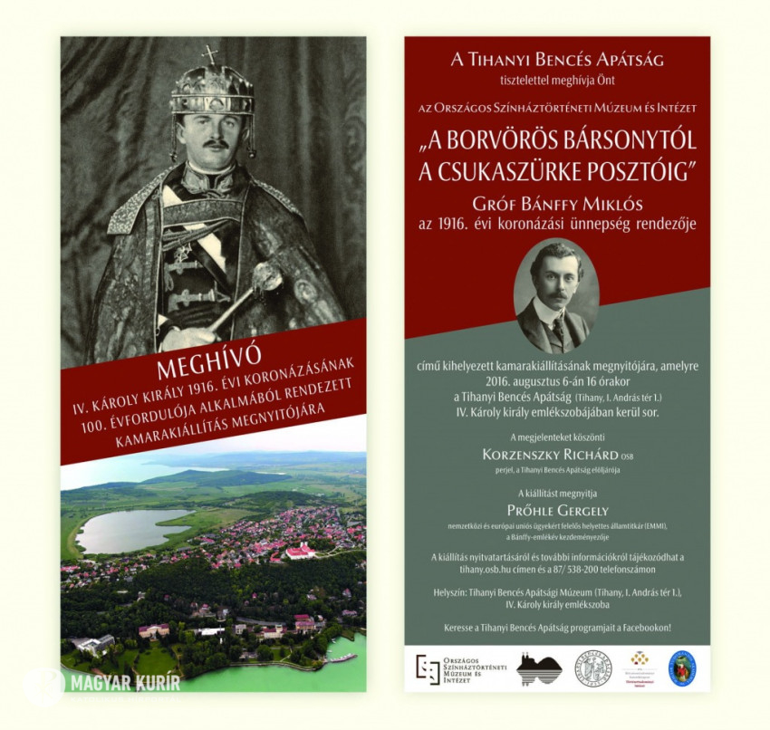 A „Borvörös bársonytól a csukaszürke posztóig” – Gróf Bánffy Miklós, az 1916. évi koronázási ünnepség rendezője című kihelyezett kamarakiállítást augusztus 6-án a Tihanyi Bencés Apátság IV. Károly király emlékszobájában nyitották meg Korzenszky Richárd, az apátság elöljárója részvételével.
