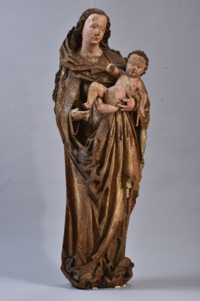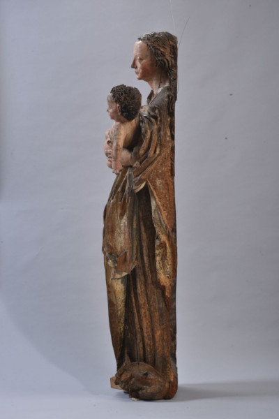 A 170 cm magas Madonna-szobor a Napbaöltözött Asszony apokaliptikus alakjából önállósult Mária-ábrázolások egyik jellegzetes példája, amint arra a lába alatt eredetileg elhelyezett holdsarló utal. A 15-16. század fordulóján meglehetősen általánosan elterjedt ábrázolás-típus mind önállóan, mind szárnyasoltárok részeként felbukkan, magyarországi példái is bőven akadnak. A mára erősen kopott, több helyen hiányos és egykori igen erős rovarfertőzések nyomát mutató szobor, eredeti formájában gazdagon aranyozott volt, ruháján fehér, vörös és kék színek maradványai figyelhetők meg. A nagyjából szemből ábrázolt Madonna hosszú, földig érő köpenyt visel, testsúlyát bal lábára helyezi, fejét enyhén balra fordítja, mozgékony gyermekét maga előtt tartva. Hosszú, eredetileg aranyszínű haja hátára omlik, fejét gyöngysoros diadém díszíti, kendője vállára csúszott és mellkasa előtt lendületes ívben átvezetve bal karját takarja. A kendő végét egykor a Kisjézus tartotta bal kezében.