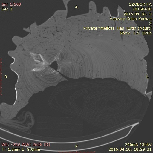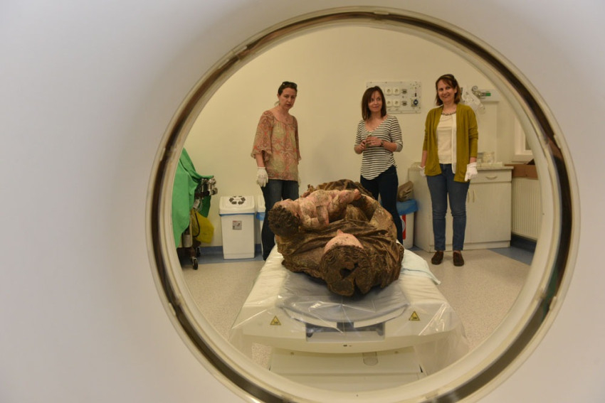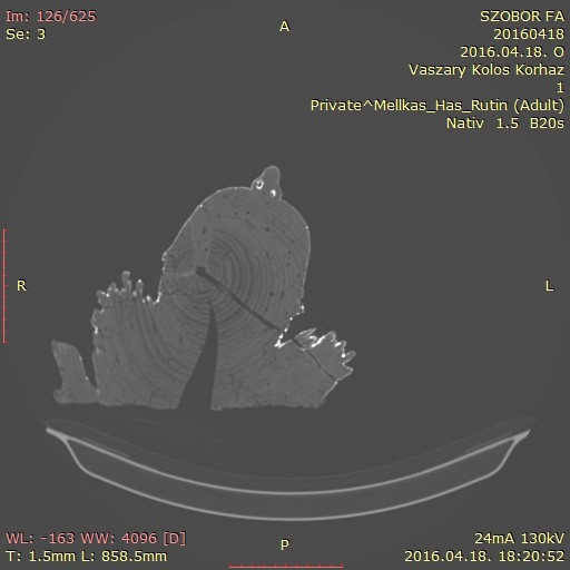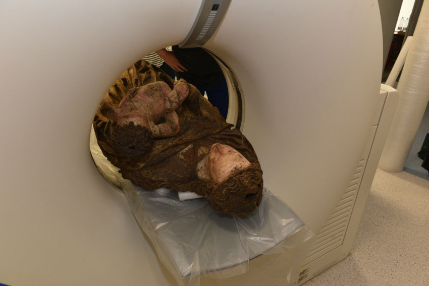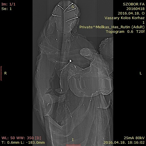 Kanász Gábor, a Vaszary Kolos kórház főigazgatója és egyben a Keresztény Múzeum baráti körének tagja olyan érdeklődéssel, lelkesedéssel és együttmüködéssel fogadta a kérést, amely minden nehézséget elhárított. Miután mind a kórház képviselői, mind a múzeumi szakemberek megbizonyosodtak róla, hogy a szobor súlya, méretei is lehetségessé teszik a munkát, és a szobor számára sem járhat a vizsgálat semmiféle veszéllyel, restaurátori és művészettörténészi jelenlét mellett, a kórház operátor munkatársának, Hanczik Csabának az irányításával megkezdődött a „páciens vizsgálata”, és igen érdekes információkra derített fényt.