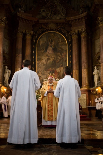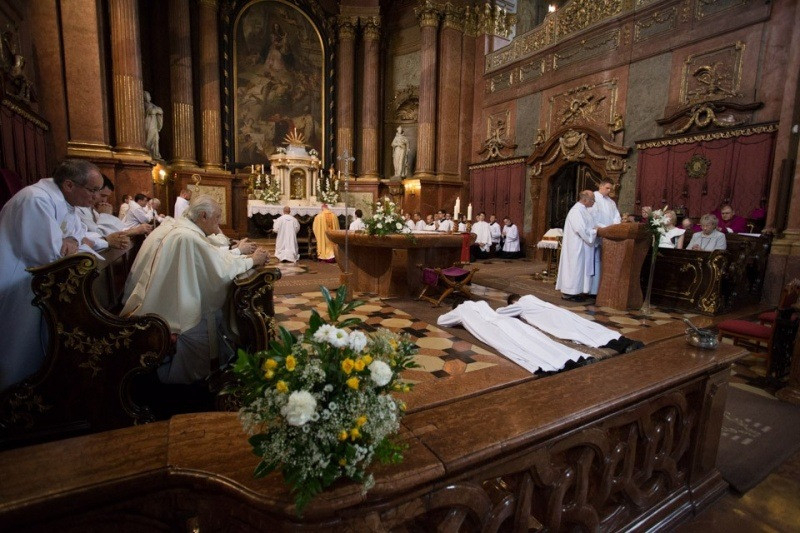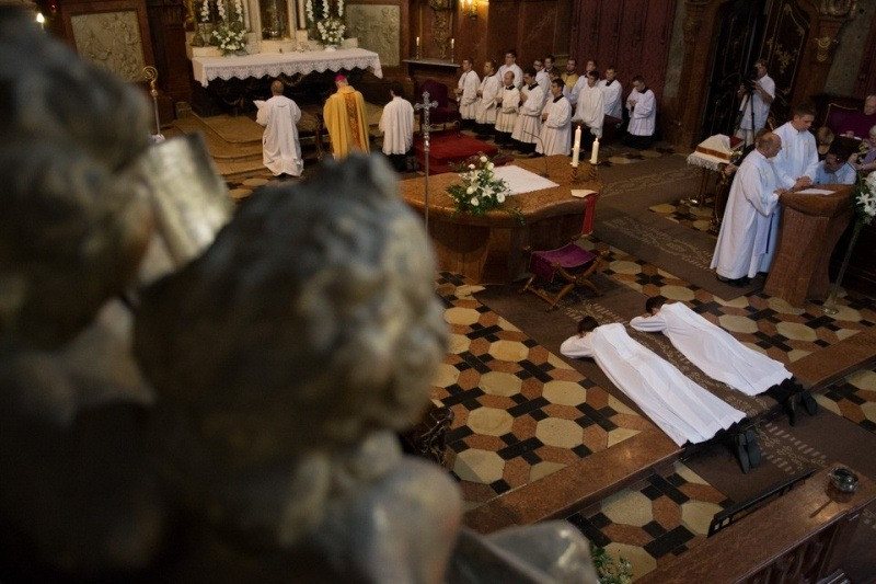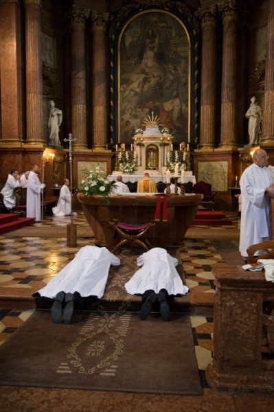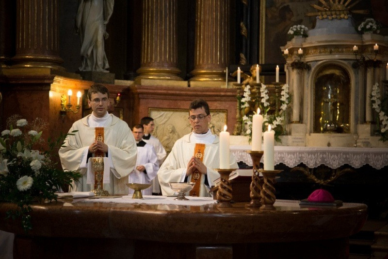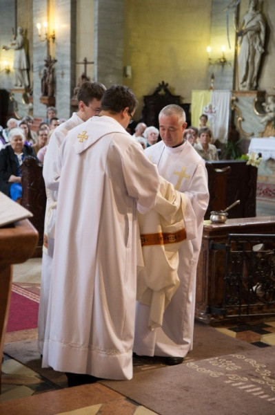 A felszentelő imádság után a paptársak liturgikus öltözékbe öltöztették a felszentelteket, az evangéliumos könyv ünnepélyes átadása után a papság békecsókot váltott a diakónusokkal. A diakónusok a szertartás folytatásában már a főpásztor mellett végeztek oltárszolgálatot a szentmise bemutatásában.